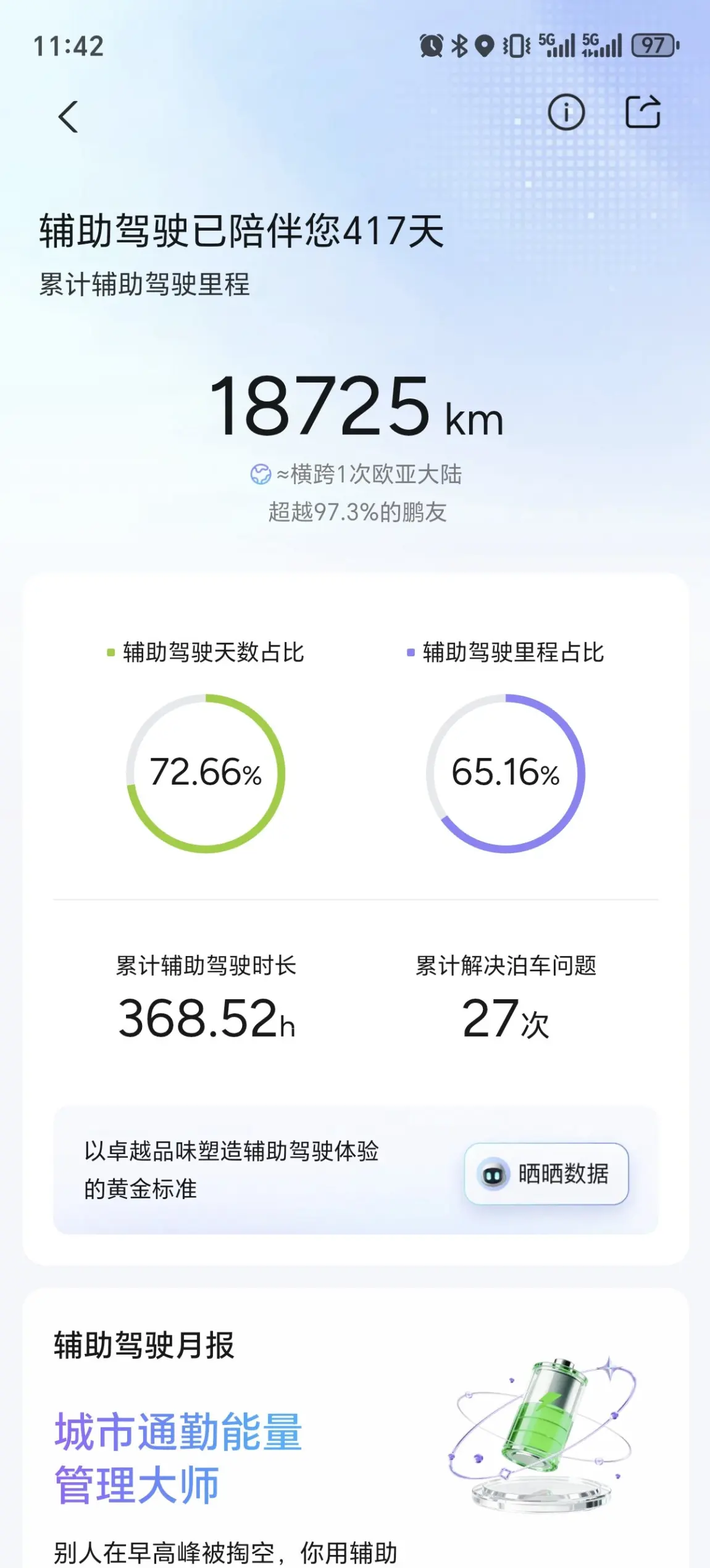 我的车是24款p7+超长续航max,提车一年多点,目前总里程跑了28950km,ngp智驾开了18725km,智驾占比64.7%。自从更新了5.9.5之后,真的感觉ngp开得越来越老司机了,每天通勤都忍不住多开一段ngp。
