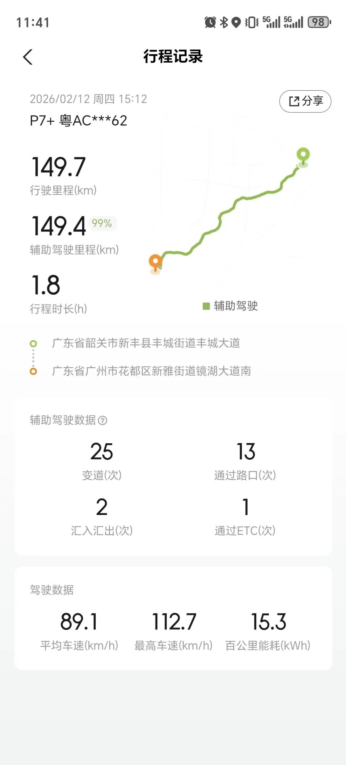 过年了,2月12日,载着家人从新丰县回广州花都过年,全程149.7km,ngp智驾开了149.4km,占比99.8%!哈哈😄很不错,这是我购车一年多以来,单次ngp智驾占比最高的一次,必须晒一晒纪念一下👇
