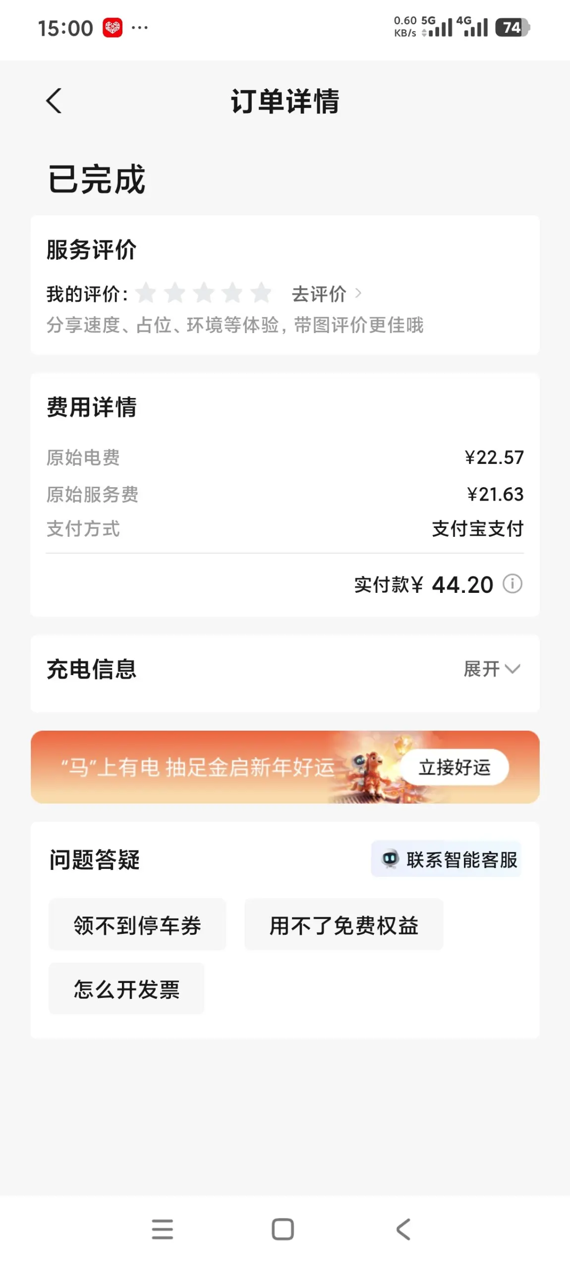 虽然服务费占比不低,但考虑到S4超快充带来的时间成本节省,以及会员价的优惠(¥1.56/度),整体性价比还是很高的。此外,站点还提供停车优惠和免费权益,进一步降低了用车成本。