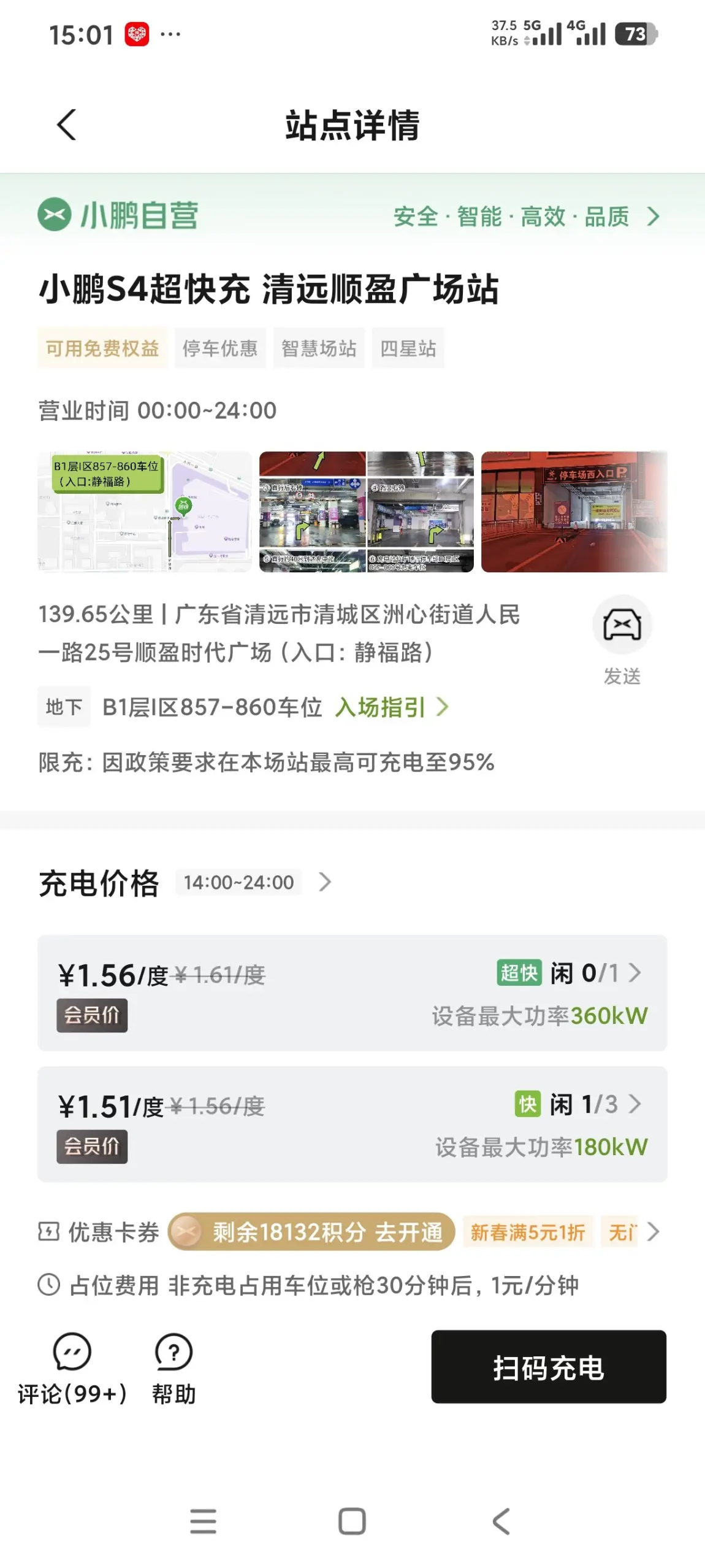 这次充电的站点是小鹏S4超快充清远顺盈广场站,位于地下B1层,车位编号清晰,入口指引明确,即使是第一次来也能轻松找到。站点是小鹏自营的四星场站,24小时营业,非常方便。