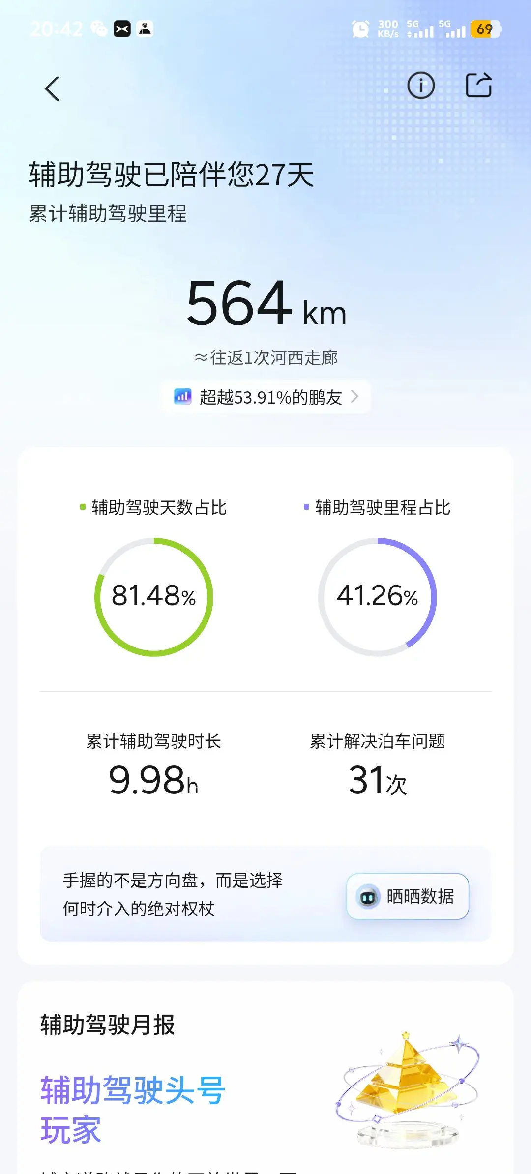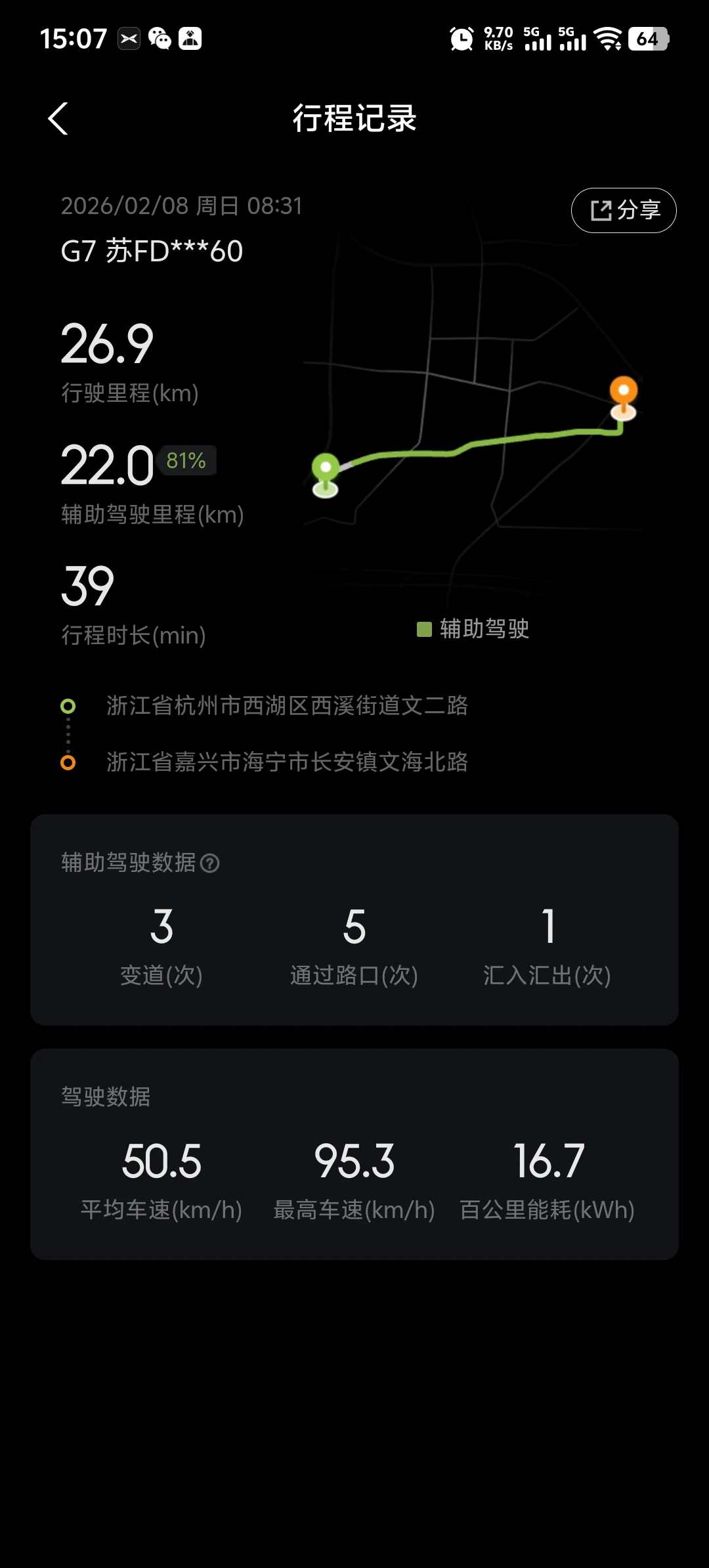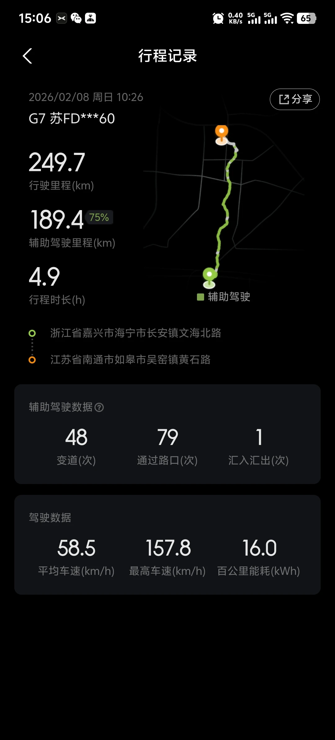 G7提车半年。辅助驾驶经历了好几个版本,最近更新了6.0最新版本之后,感觉辅助驾驶好用很多。这次从浙江杭州回到江苏南通。没有走高速,一路走的快速路,辅助驾驶帮助很大😄👍#开着小鹏回家过年# #我的辅助驾驶高光时刻#