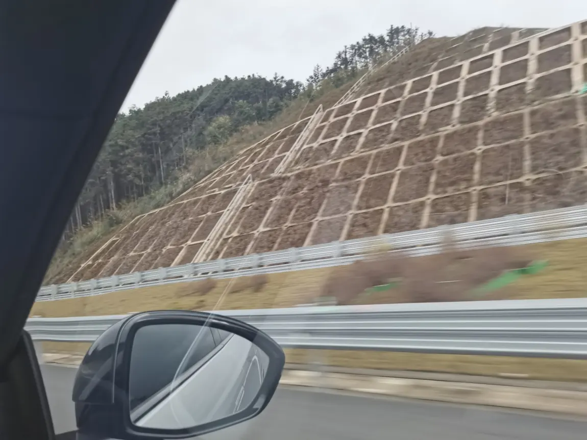 - 高速两旁的边坡上,整齐的护坡工程在薄雾中若隐若现。