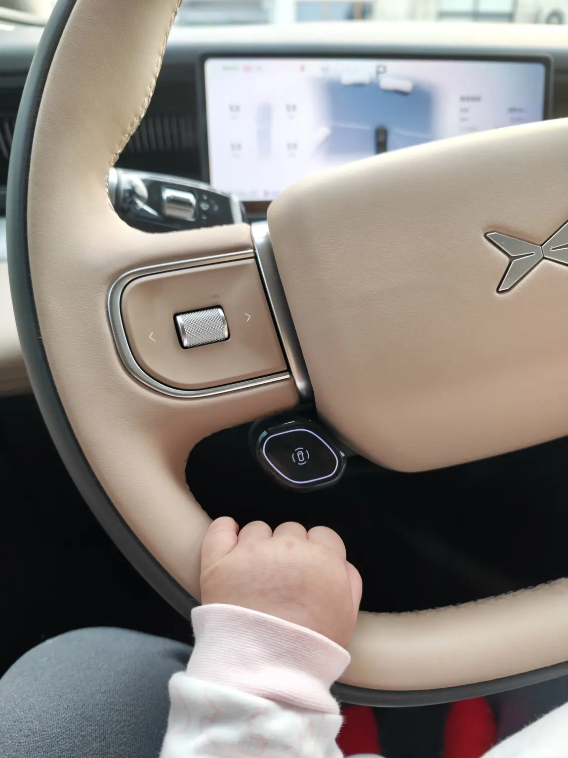 第一张照片,是宝宝小手轻轻握住方向盘。