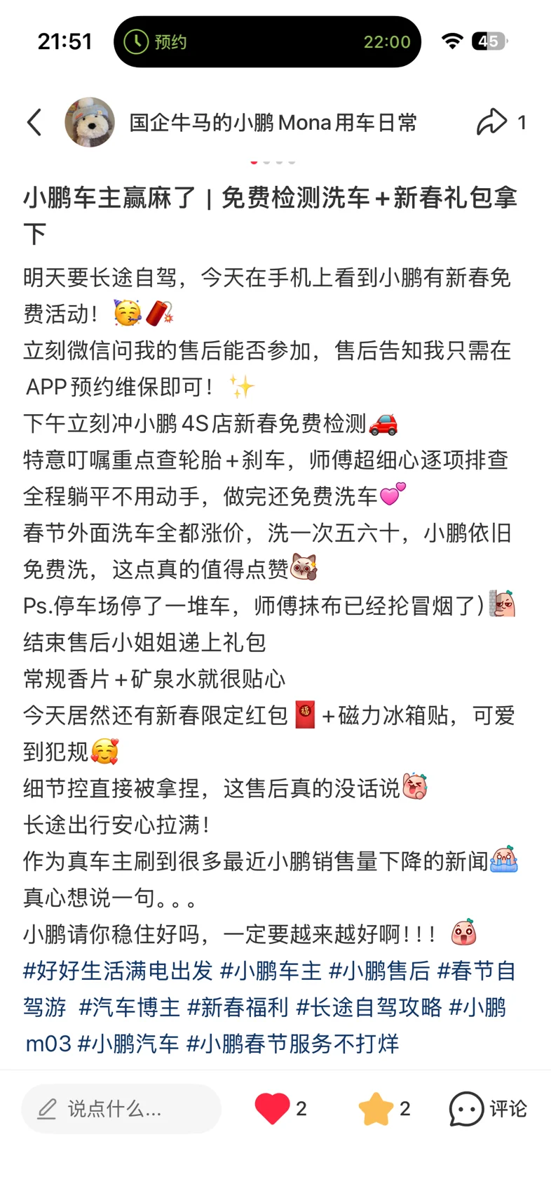 #好好生活满电出发 #小鹏车主 #小鹏售后 #春节自驾游 #汽车博主 #新春福利 #长途自驾攻略 #小鹏m03 #小鹏汽车 #小鹏春节服务不打烊