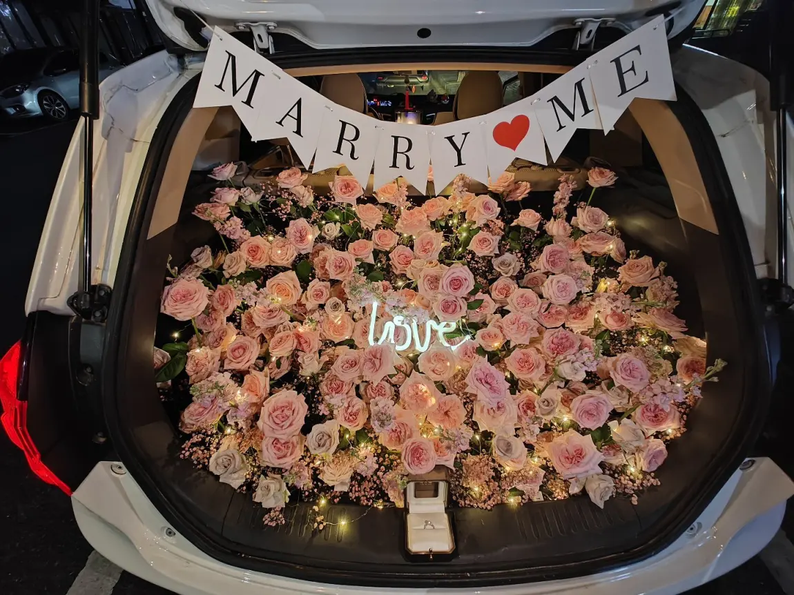 #藏在车生活里的浪漫# 鹏友们,分享我的求婚经历啦!那天说去兜风,到了超美的海边停下。让对象去后备箱拿东西,一打开,对象直接惊喜住了,满满后备箱的鲜花,粉玫瑰中间的love和戒指格外醒目。我然后单膝跪地深情告白,海风轻拂,花香弥漫,幸福得稀里哗啦!真心觉得,这次藏在车后备箱鲜花里的求婚,会让我记一辈子!