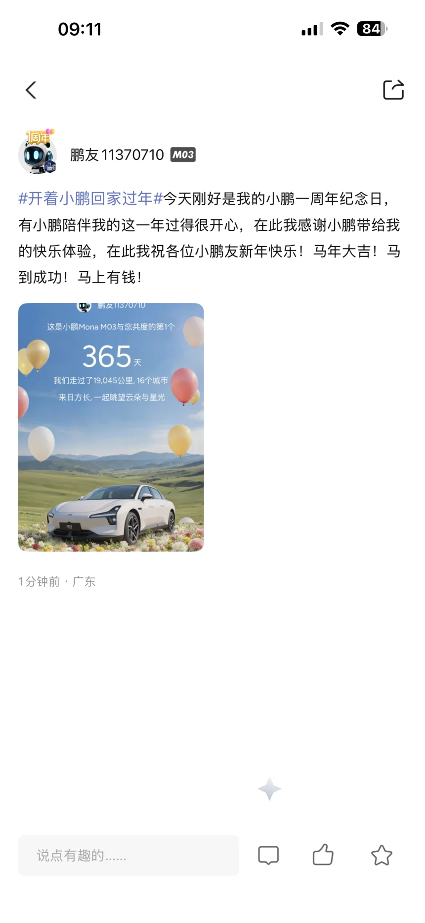今天刚好是我的小鹏一周年纪念日,有小鹏陪伴我的这一年过得很开心,在此我感谢小鹏带给我的快乐体验,新年来临之际,我祝各位小鹏友新年快乐!马年大吉!马到成功!马上有钱!