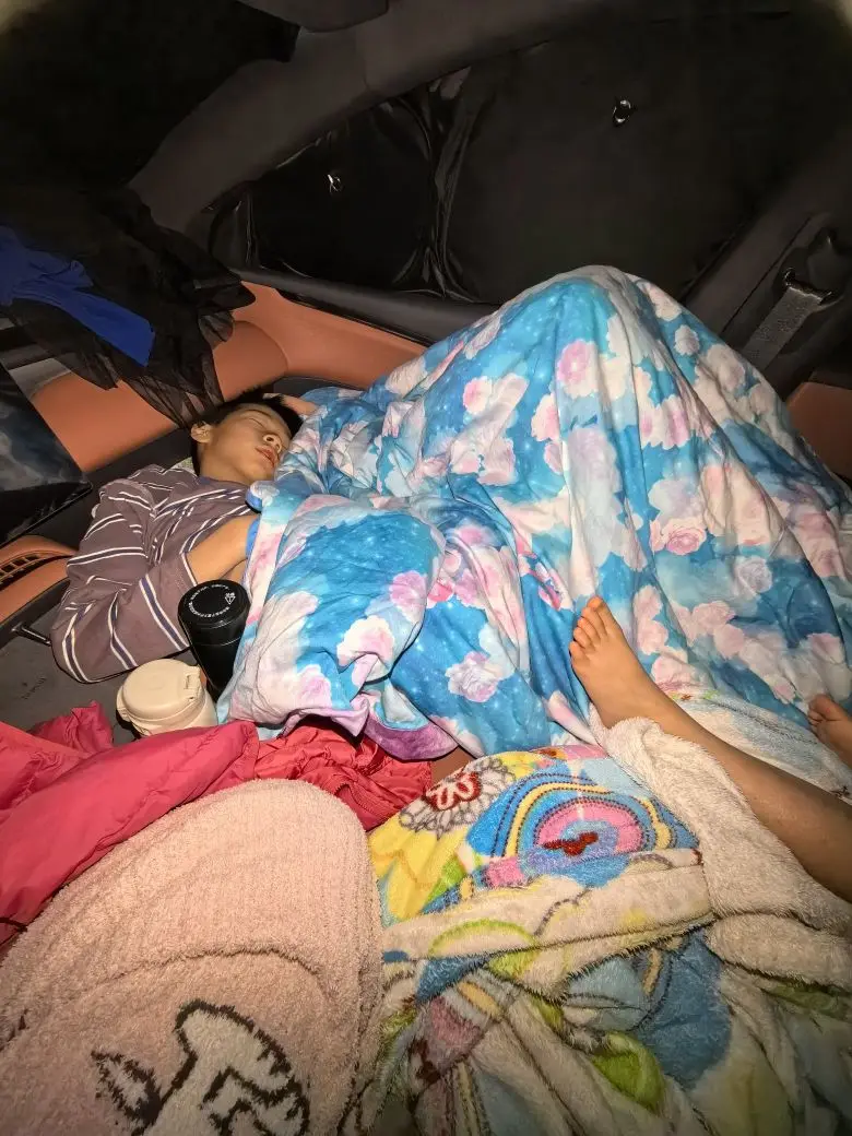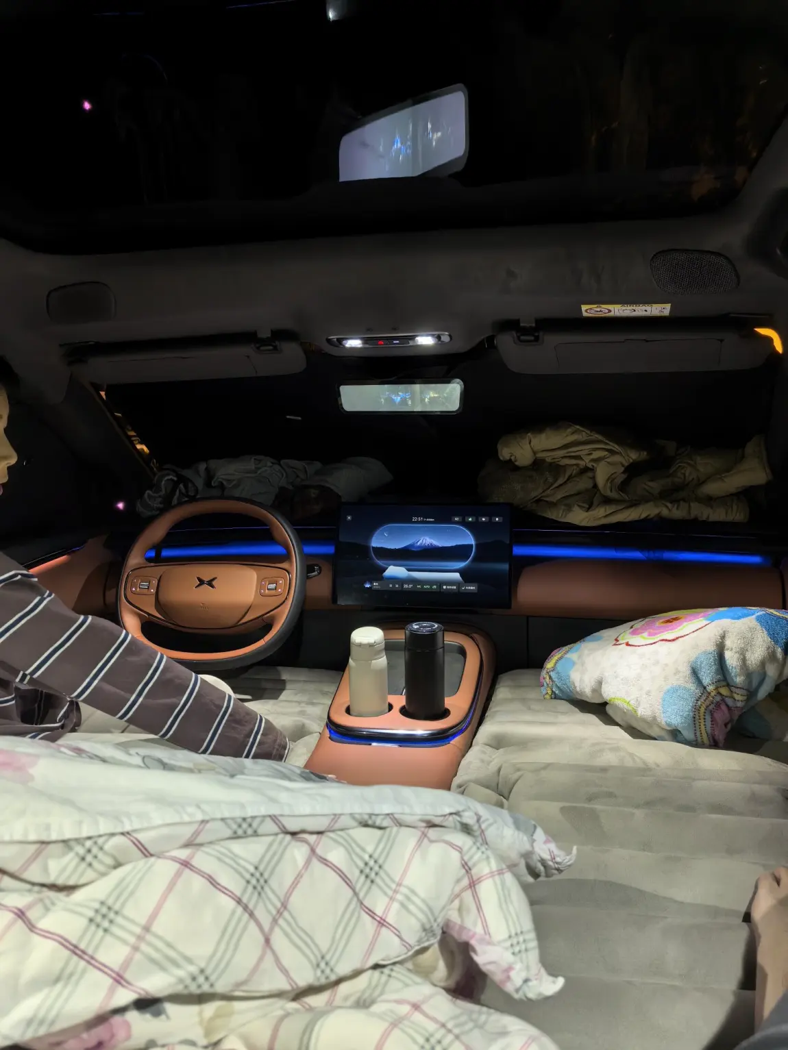 🌙 昨天去泡温泉,想着晚上直接睡车上,特意提前铺好了床垫,带上洗漱用品,准备舒舒服服泡完回来倒头就睡。上车后打开了睡眠空间,锁车去泡汤啦~
