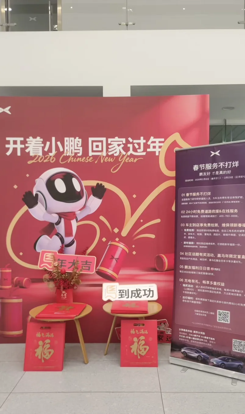 新春启程,守护在线!小鹏春节服务不打烊,春节期间全国服务门店均安排值班人员坚守岗位,7×24小时道路救援时刻待命。车主到店提供以下8项免费车辆检测服务:三电系统关键零部件、刹车片、轮胎、蓄电池、雨刮片、玻璃升降器、空调系统、摄像头,还能免费加满玻璃水。备件充足,让安心与年味同行。无论是归乡途中的突发需求,还是假期出行的维保计划,这个马年,让小鹏陪你驭风而行,奔赴山海团圆!#小鹏汽车 #小鹏春节服务不打烊 #开着小鹏回家过年 #分享新春服务体验