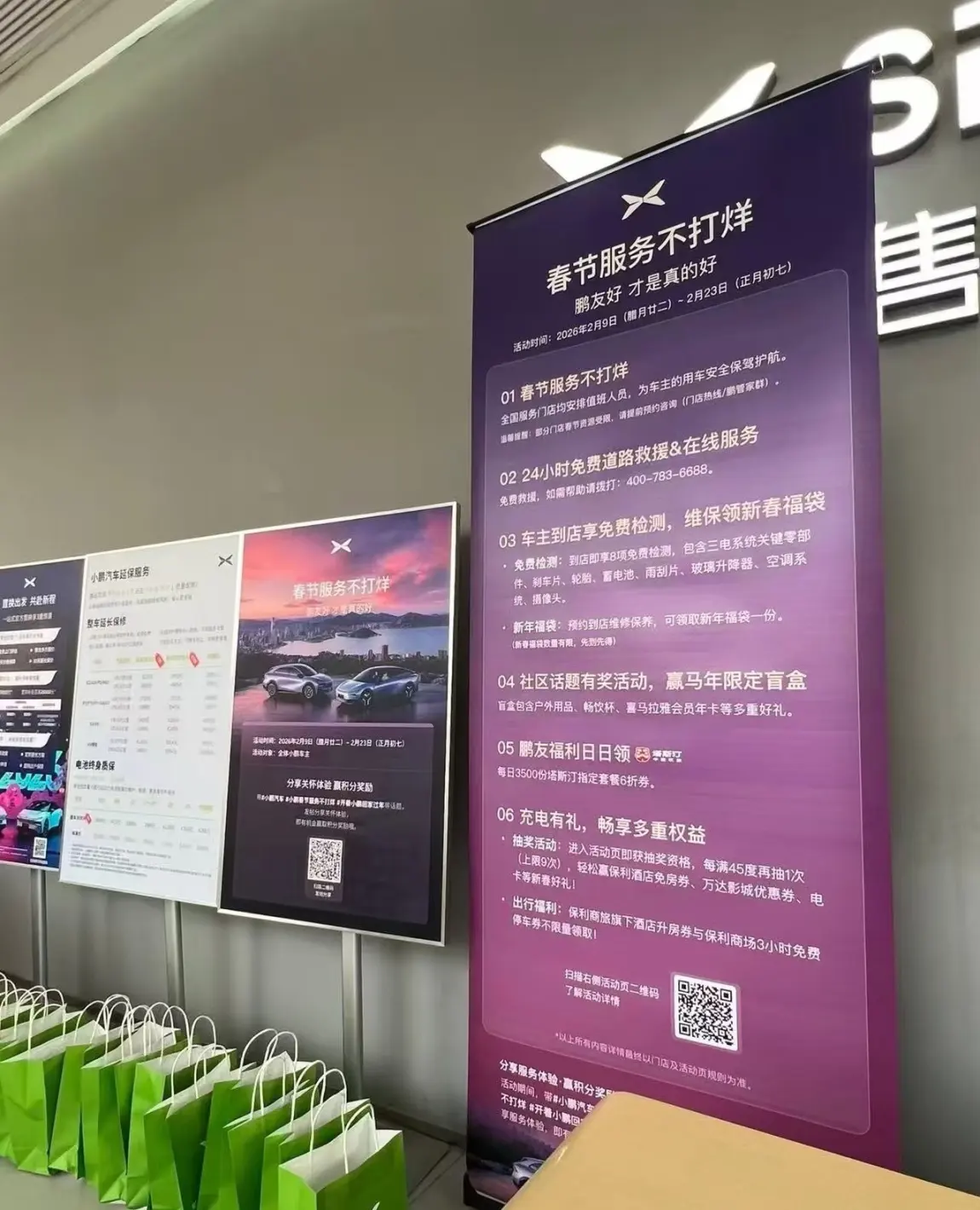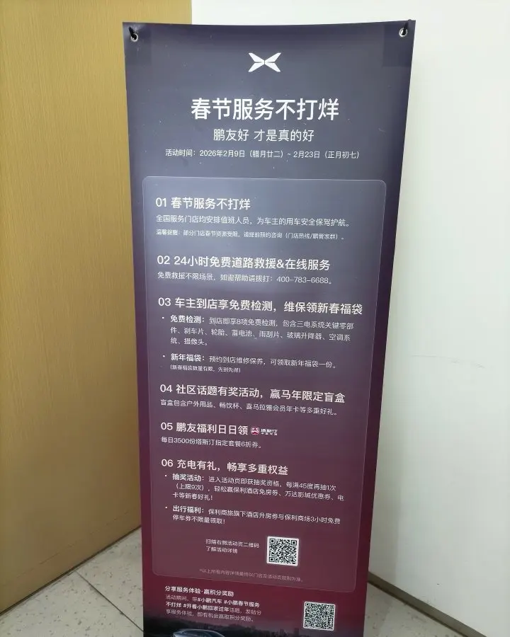 新春返乡前给小鹏做检测,真切感受到春节服务不打烊的暖心!到店后售后管家热情接待,师傅细致做了8项免费检测,三电、轮胎、刹车片逐一排查,还贴心加满玻璃水、把车洗得干干净净。休息区有免费饮品,等待时全程收到维修进度推送,结束后还领到了新春福袋,香包和小礼品超有年味。全程专业又贴心,小鹏的暖心服务,让我开着爱车安心奔赴团圆路,春节出行超有底气!#小鹏汽车 #小鹏春节服务不打烊 #开着小鹏回家过年