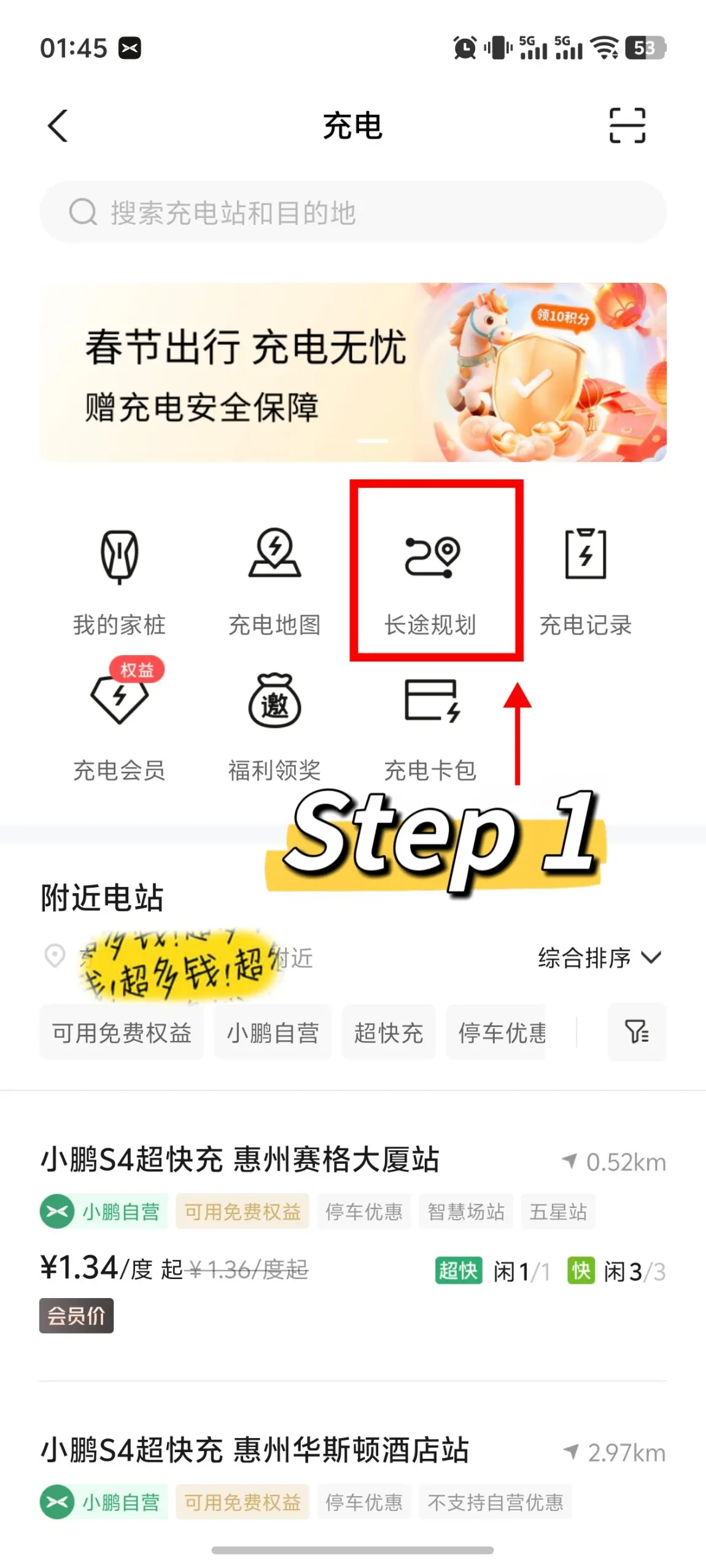 1. 打开小鹏APP,进入「充电」页面,点击长途规划入口。(图4)