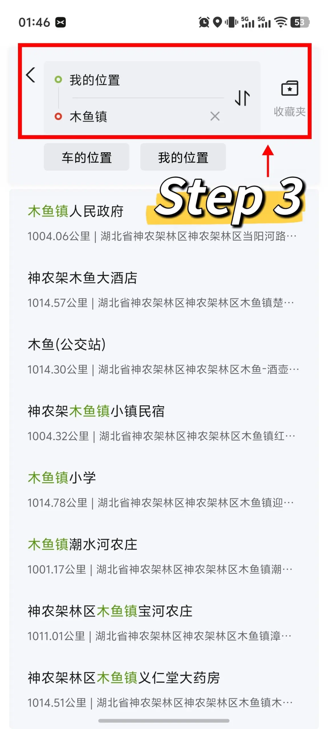 3. 起点选「我的位置/车的位置」(可以根据实际设置),终点输入「木鱼镇」,再选择具体位置获取精准路线。(图6)