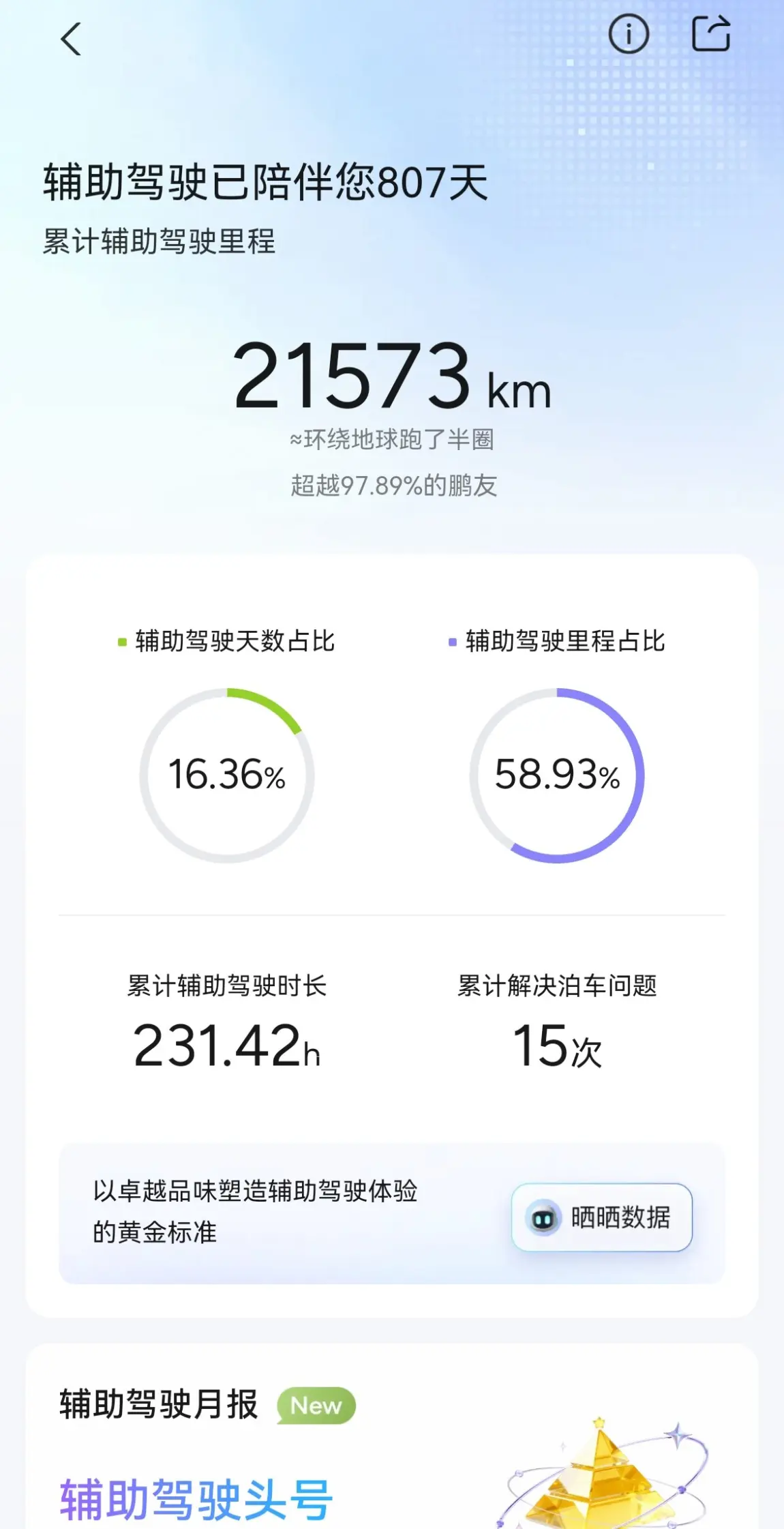#开着小鹏回家过年# #我的辅助驾驶高光时刻# 辅助驾驶已经陪伴我807天,累计里程21573公里,相当于绕地球半圈,超越了97.89%的鹏友。 这807天里,辅助驾驶时长达到231.42小时,里程占比58.93%,帮我解决了15次泊车难题。每次长途回家,高速NGP都能精准应对车流和路况,让我在春运的高速上更从容;遇到复杂车位,自动泊车也总能稳稳停好。新的一年,期待小鹏的辅助驾驶能覆盖更多场景,让每一次回家的路都更轻松、更安心。