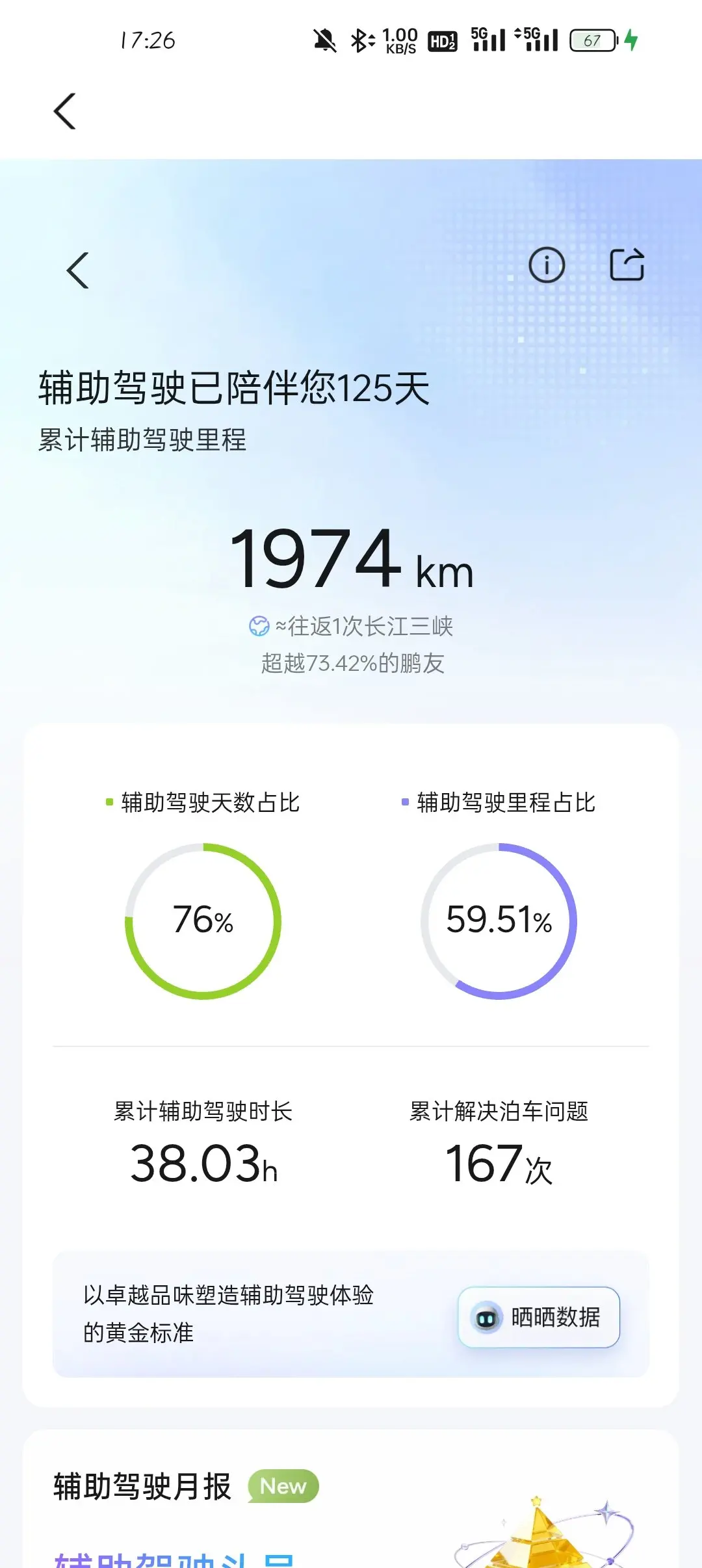 🚗 小鹏P7辅助驾驶体验|通勤&高速的快乐搭子 ✅ 高速通勤救星 - 辅助驾驶天数占比76%,高速上解放双脚,长途也不犯困- 累计38.03小时的辅助时长,让通勤路变得轻松又安心 ✅ 智能泊车yyds - 累计解决167次泊车难题,侧方、倒车入库一键搞定- 新手也能秒变老司机,再也不用为停车焦虑 #我的辅助驾驶高光时刻# #开着小鹏回家过年#