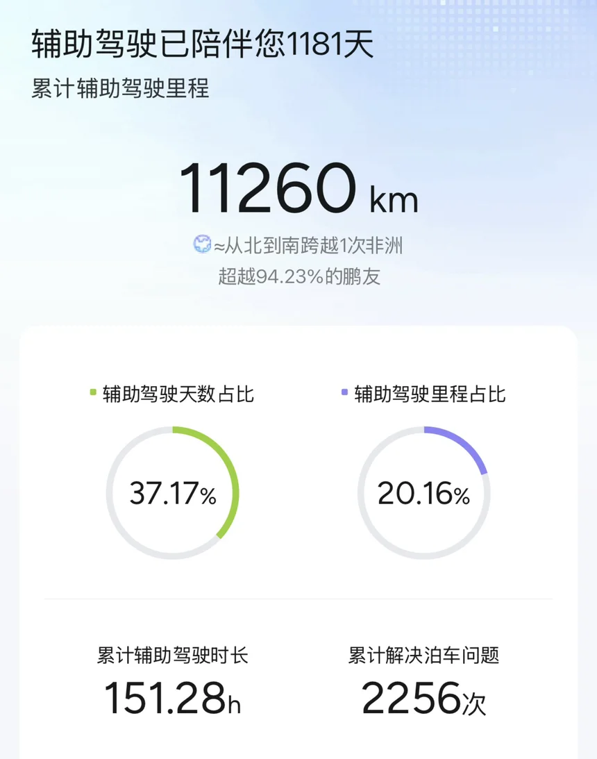 #我的辅助驾驶高光时刻# #开着小鹏回家过年#🚗开着小鹏回家过年,辅助驾驶就是我的“春运搭子”!1181天陪伴,累计11260km辅助驾驶里程,相当于从北到南跨越1次非洲!37座点亮城市,478天历时时长,每一次智能变道、自动泊车,都让返乡路更从容。感谢小鹏XNGP,让长途驾驶不再疲惫,安全与便捷一路随行~