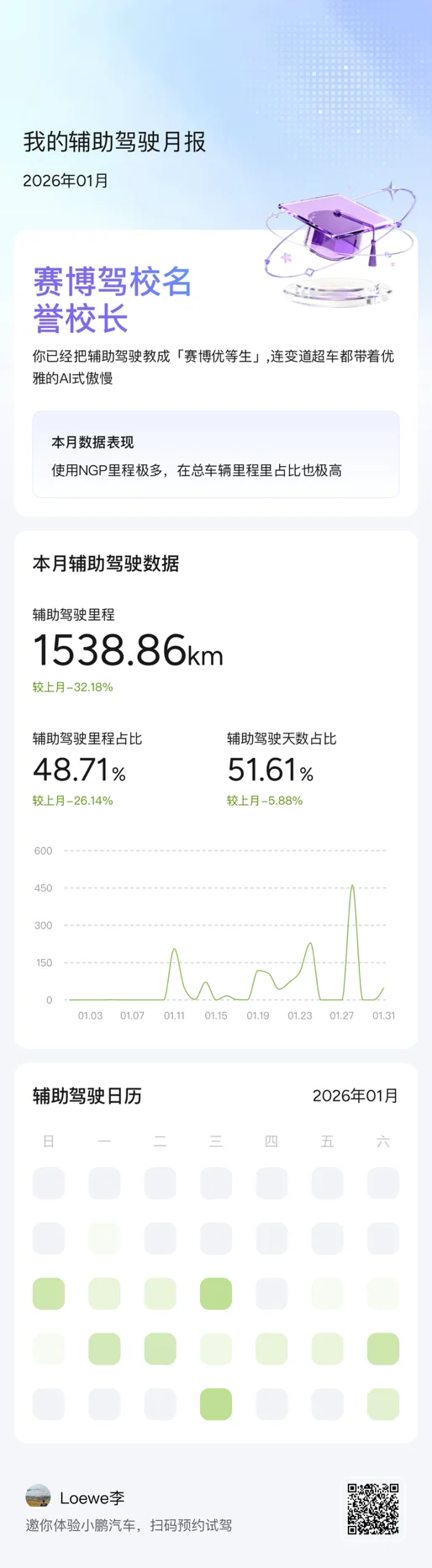 从城市快速路到高速主路,再到复杂的省道路段,能精准识别路况,自动跟车、变道、超车,高速施工避开雪糕筒也能从容应对。最让我印象深刻的是在一段大雾天气,NGP依然保持着稳定的车距和车速,让我在长途驾驶中多了一份安心。辅助驾驶里程1538.86km,占比48.71%,不仅是数据,更是科技带来的安全感和舒适感。有了它,回家的路不再漫长,而是变成了一段轻松的旅程。#开着小鹏回家过年 #我的辅助驾驶高光时刻