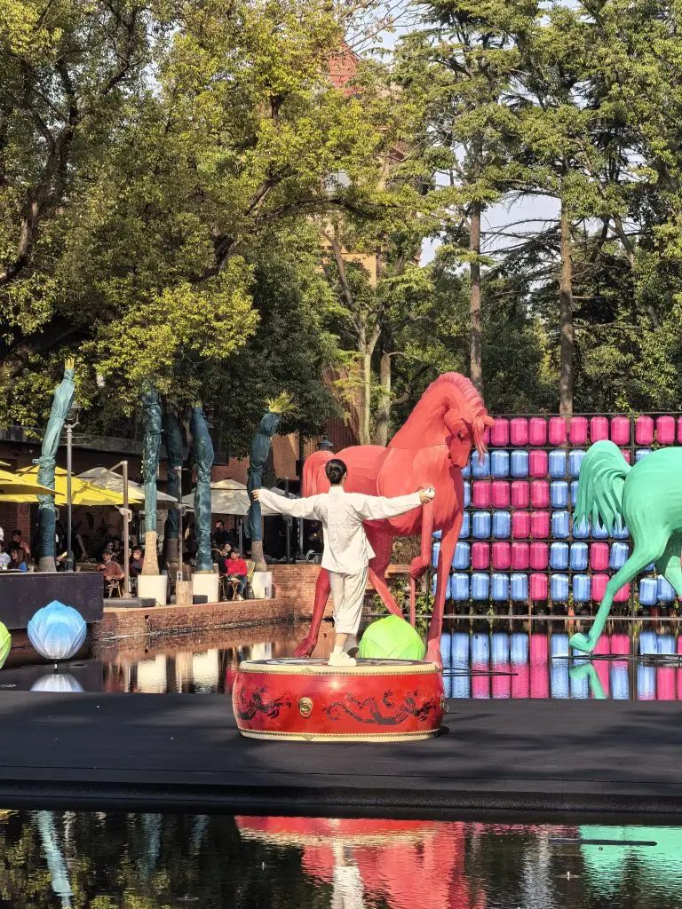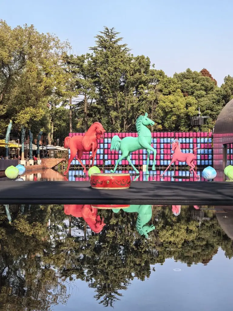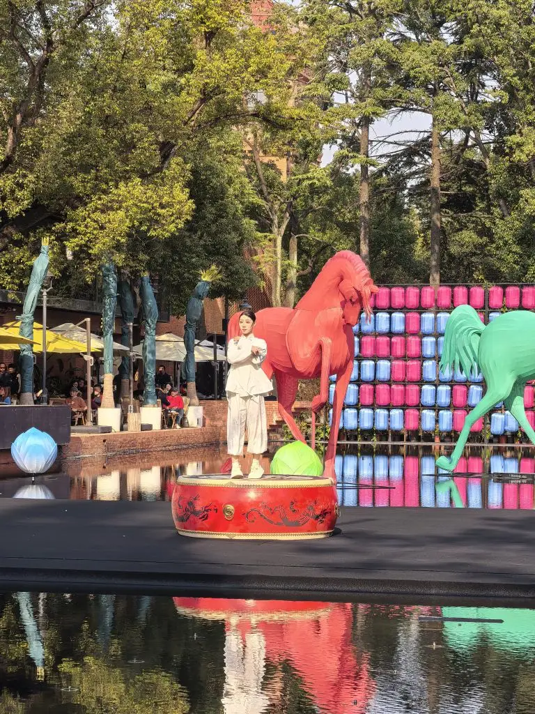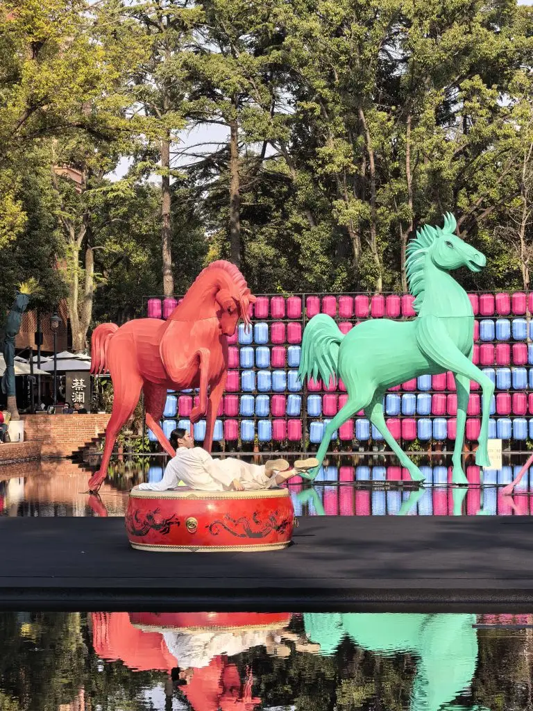 #定格我的精彩瞬间# 水面上,一红一绿两匹骏马昂首挺立,似在追逐风的自由。舞动在绘有龙纹的红鼓上,看涟漪将彩色灯笼的倒影揉碎,又拼凑成流动的画卷。这一刻,喧嚣被隔绝在水面之外,只有艺术与自然的低语,在光影交错间,将心灵轻轻托起。#开着小鹏回家过年#