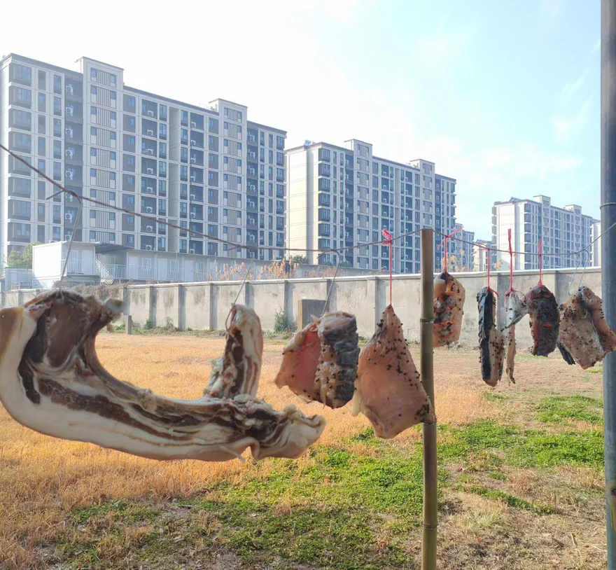 最有仪式感的是备年货,肉皮经清洗、熬煮,凝成弹润的肉皮冻;香肠、腊肉挂在竹竿上,在冬日暖阳里慢慢风干,飘出阵阵咸香。大门上贴好福字与春联,木窗格挂着“马上有钱”的红马挂饰,每一处布置都藏着对新年的期许。