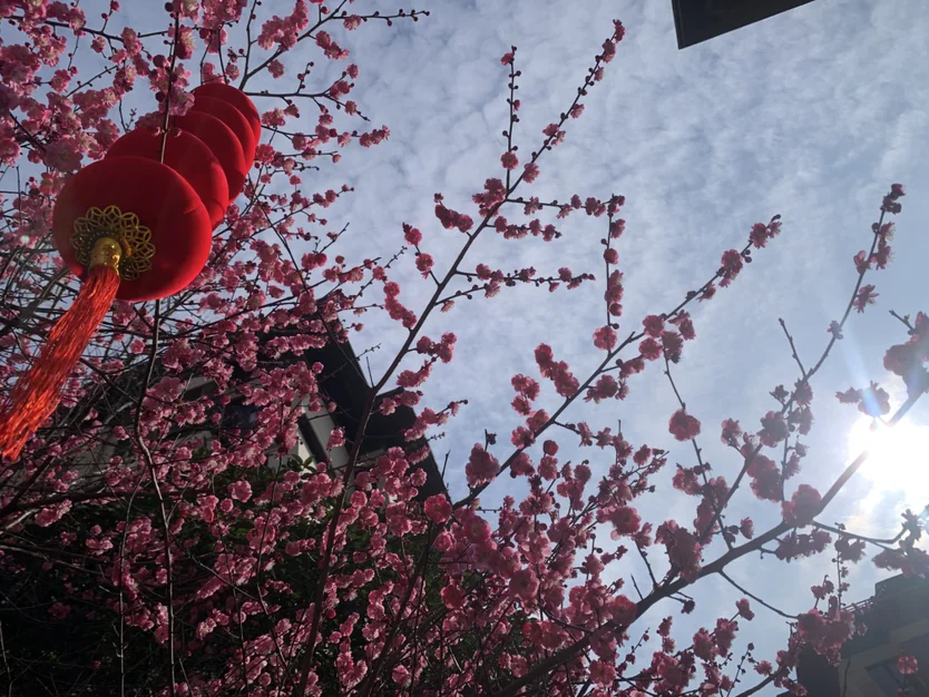 #定格我的精彩瞬间# #开着小鹏回家过年# 仰头眯眼看着花枝间漏下的光斑,这倒奇了,腊月才过半呢,小区里的桃花就赶着年节开得这般闹。您瞧那灯笼穗子扫着花枝,风一过,簌簌地往下掉胭脂似的瓣儿,倒像替春联研朱砂呢。