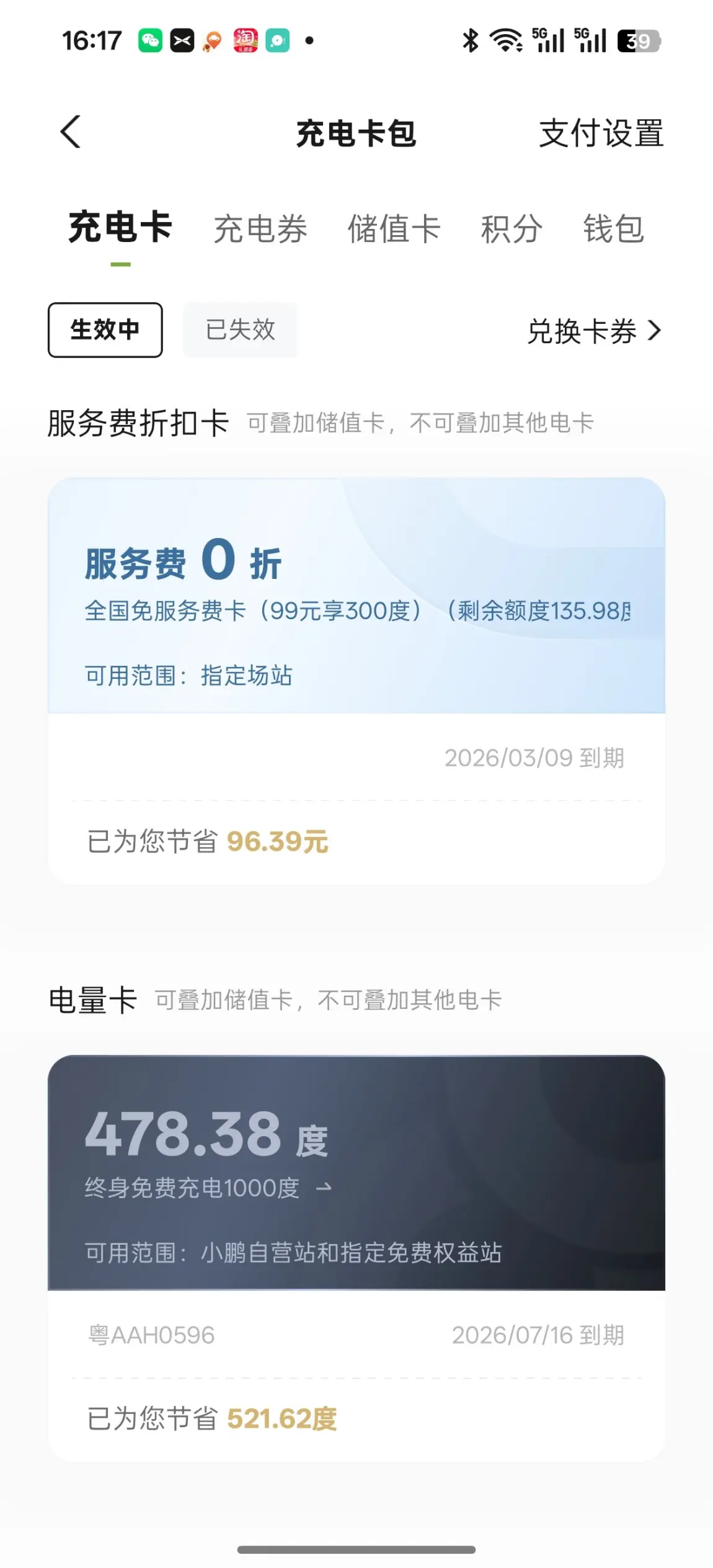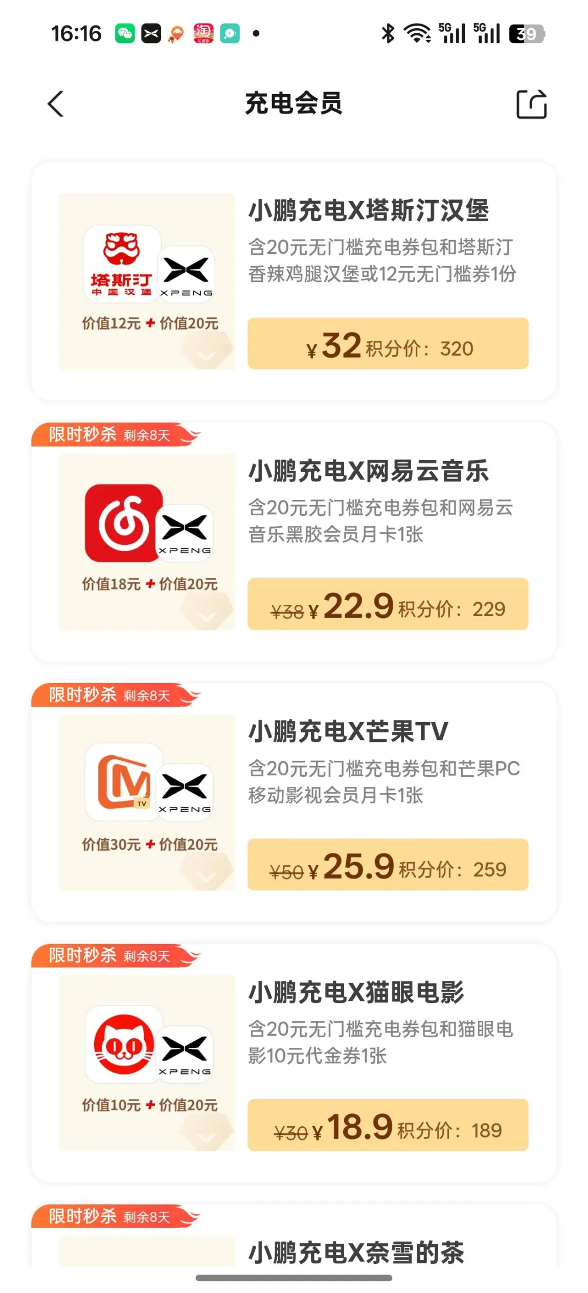 3.可以结合小鹏商城的电卡产品,选择免服务费卡,优惠券包等,挺划算的;还有送奶茶,网易云会员等的优惠券包组合,通用第三方充电桩的电卡等等~