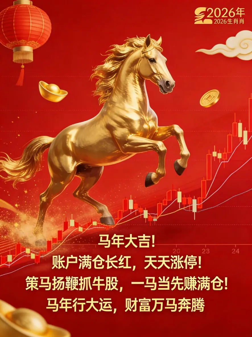马年大吉!祝你2026年:账户满仓长红,天天涨停!策马扬鞭抓牛股,一马当先赚满仓!马年行大运,财富万马奔腾 🐎!