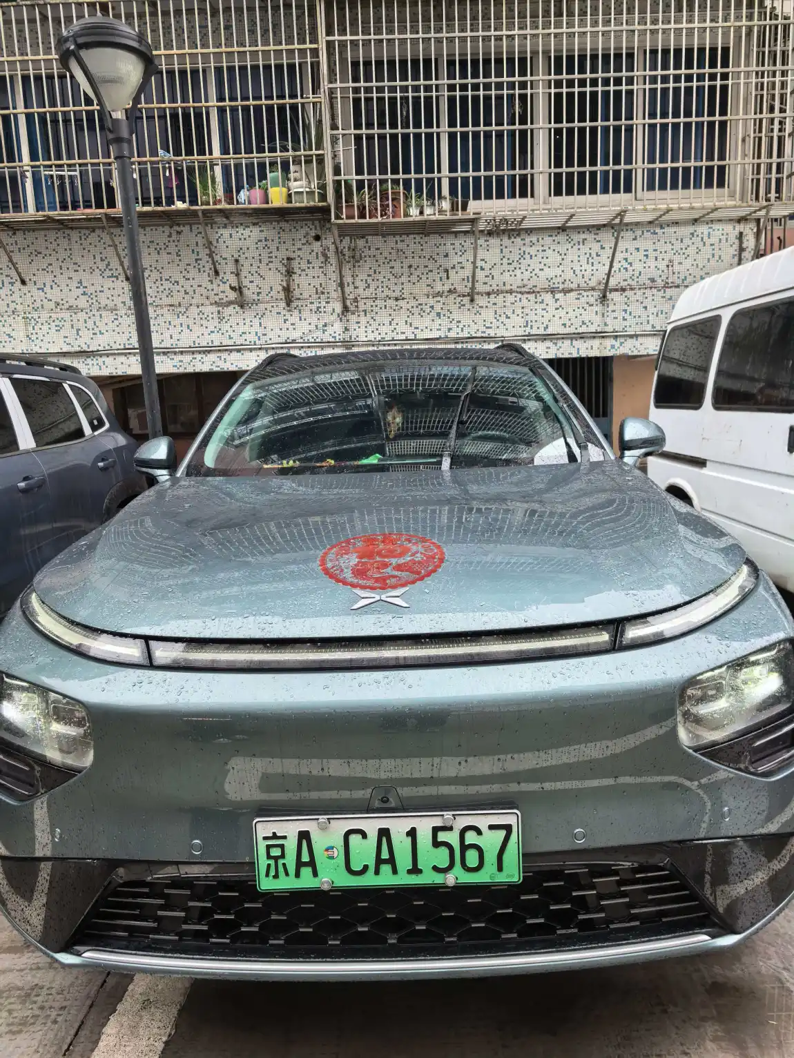 接着,我们下楼给车也添上了年味。我把一张印着锦鲤的“福”字贴在副驾驶车窗上,女儿则在车头引擎盖上,仔细地抚平了一个鲜红的窗花。雨丝落在车身上,水珠里映着那抹红,像给我们的小鹏G9戴上了一枚新年的勋章,提醒着我们,无论驶向何方,家的福气都一路相伴。