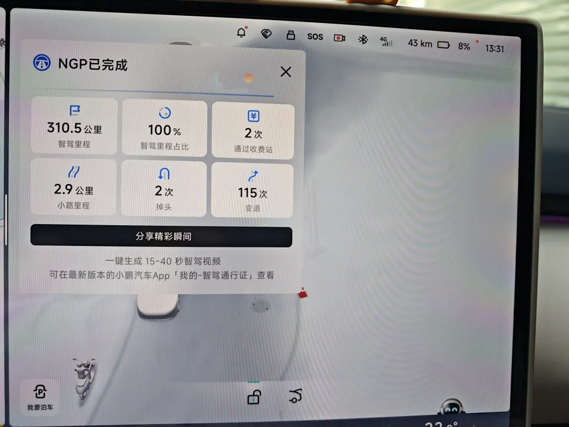 #开着小鹏回家过年# #我的辅助驾驶高光时刻# 回家过年,NGP一年比一年顺了,今年5.9.5版本在基础能力打磨就很好,不追求什么新奇惊艳,稳稳当当,舒舒服服,悄无声息做好驾驶辅助,就非常轻松了。这次舒适性和安心感都够,当然可能是几乎全程高速的原因,变道策略上,总是喜欢到最左车道这个习惯可以优化一下,懂的都懂的,高速右车道才是快车道。
