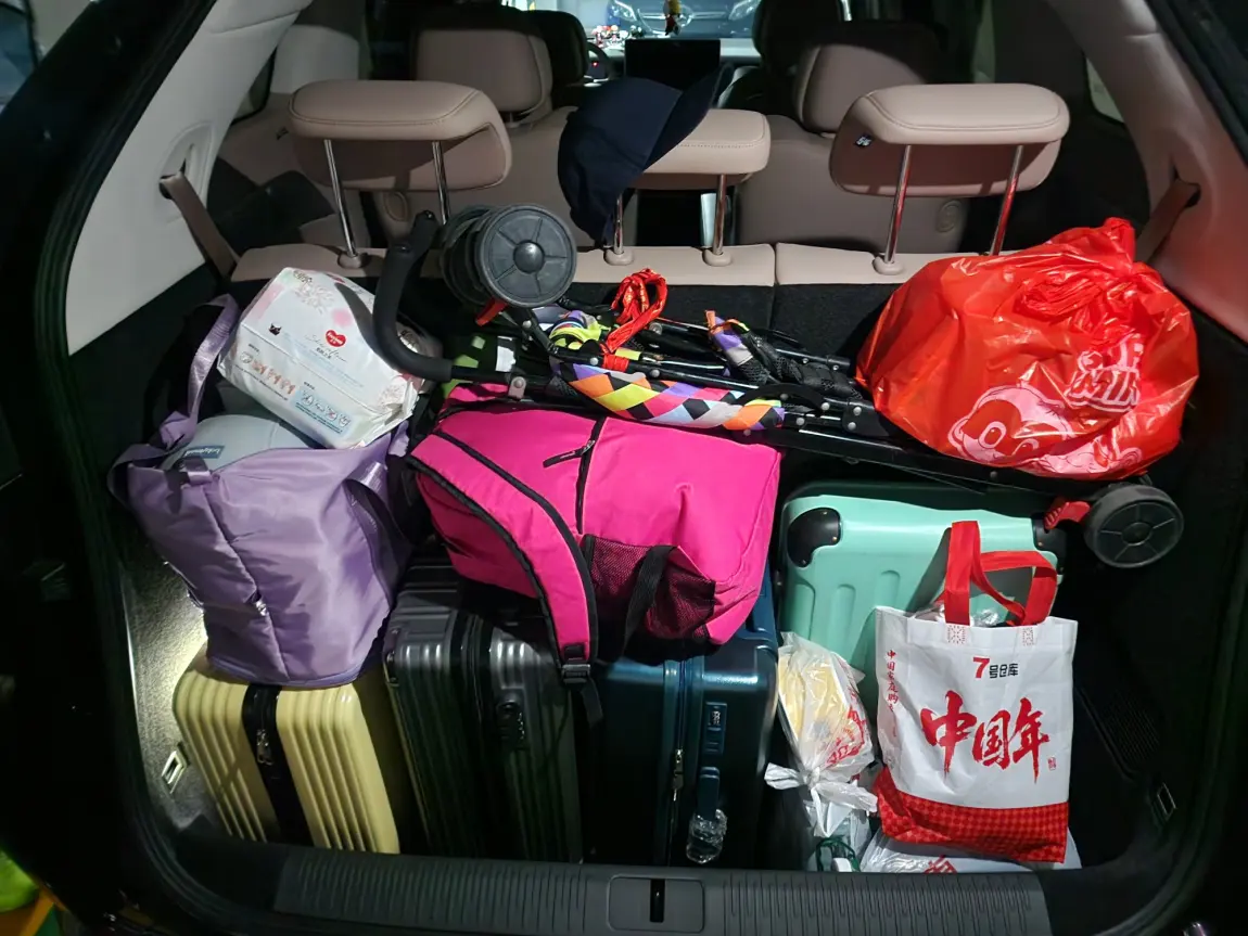 后备箱空间更是遥遥领先,四个旅行箱再加一堆杂物和宝宝车,完全没问题👌