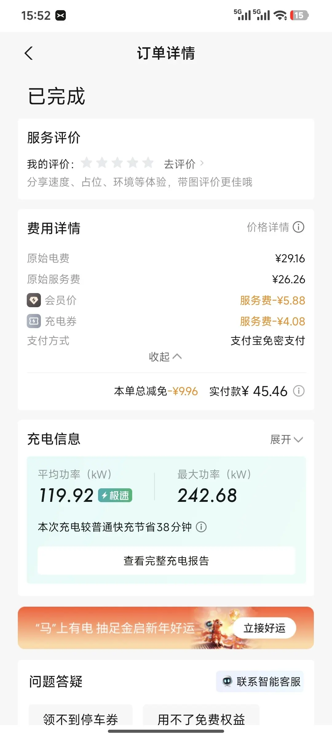 这次充电的核心体验真的拉满!实测最大充电功率达到242.68kW,平均功率也有119.92kW,仅仅38分钟就完成了高效补能,比普通快充节省了近40分钟,这段时间刚好够我散步放松、处理琐事,完全不耽误返程行程。更惊喜的是,作为小鹏充电会员,本次还享受了9.96元的减免优惠,实际仅支付45.46元,会员专属的5元立减更是省出了一瓶酸奶钱,性价比直接拉满。