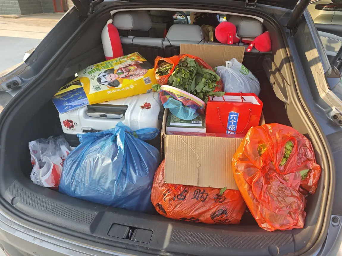 #小鹏汽车 ##小鹏MONA ## 开着小鹏回家过年 ## 小鹏MONA旺旺掀背#满满的尾箱,满满的年味。小p的尾箱还是很能装的,,除了我们的大行李箱,还有一个大纸箱放了各种礼盒,再堆上菜园子里薅的萝卜青菜,满载而归。