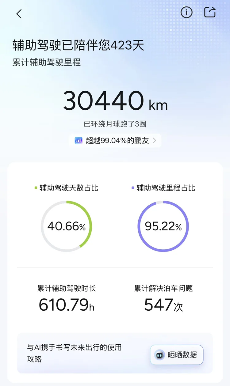 春节开着小鹏回家轻轻松松,仔细留意了一下智驾报告,原来小鹏智驾里程已经能够绕月球三圈了呀。