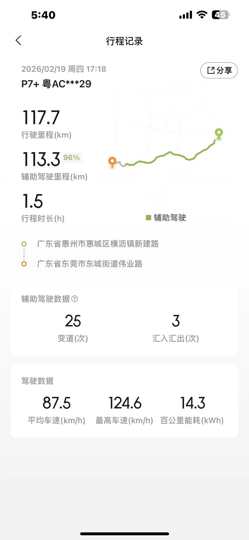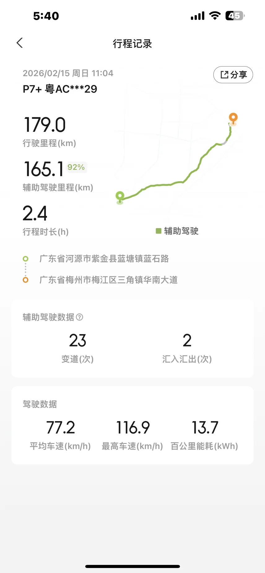 #我的辅助驾驶高光时刻# #开着小鹏回家过年# 谁说春运回家一定是“苦旅”?开着小鹏P7+,我把归乡路开出了“巡航度假”的质感。🏠今年春节往返于东莞梅州,几乎全程开启辅助驾驶,解放双脚的同时,让我有更多精力欣赏沿途的风景。最让我印象深刻的是从河源到梅州的一段路,1个多小时的车程,辅助驾驶占比高达96%,精准的车道保持和流畅的变道,让奔波变得格外轻松。短短7天,辅助驾驶陪我走过了867.5公里的归途,它不仅是智能的驾驶助手,更是我马年春节最可靠的伙伴。这就是属于我的智驾高光时刻,稳稳当当,奔赴团圆!