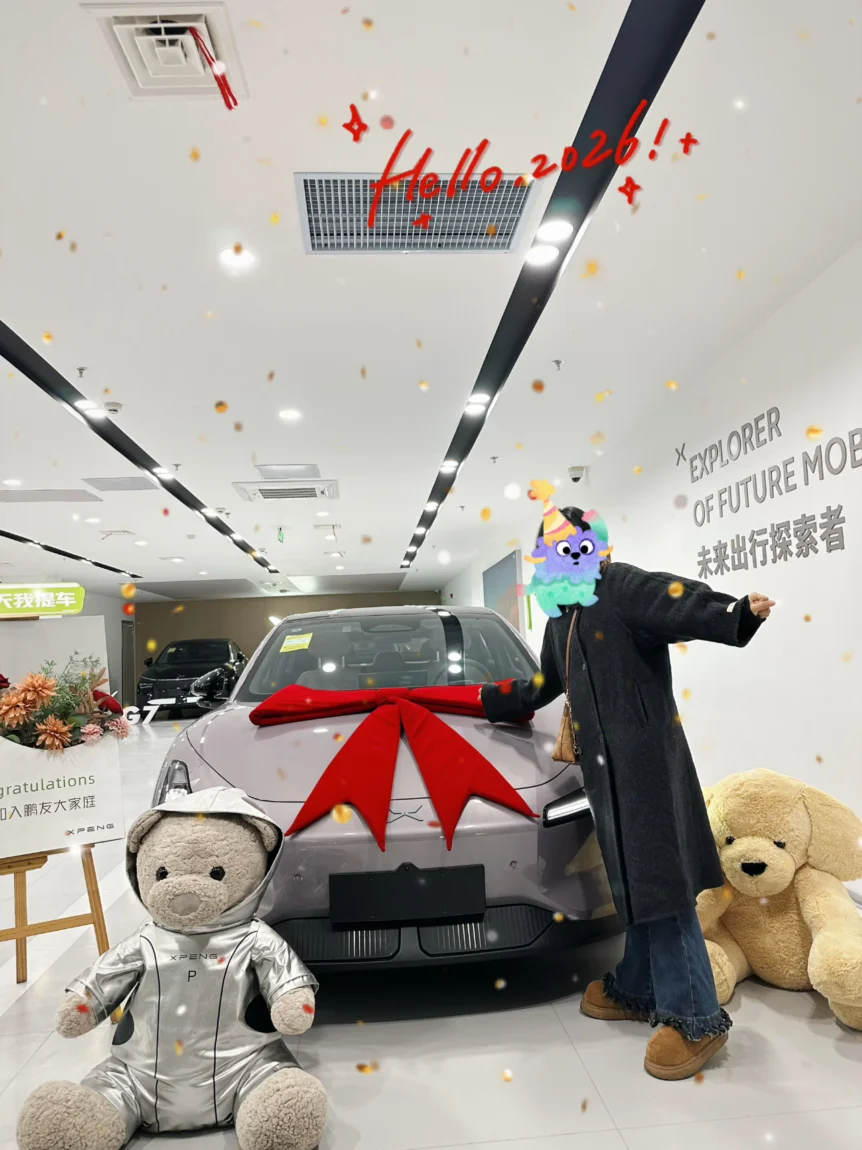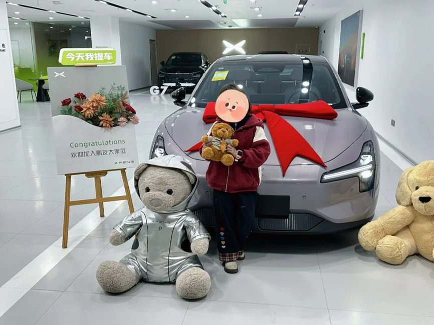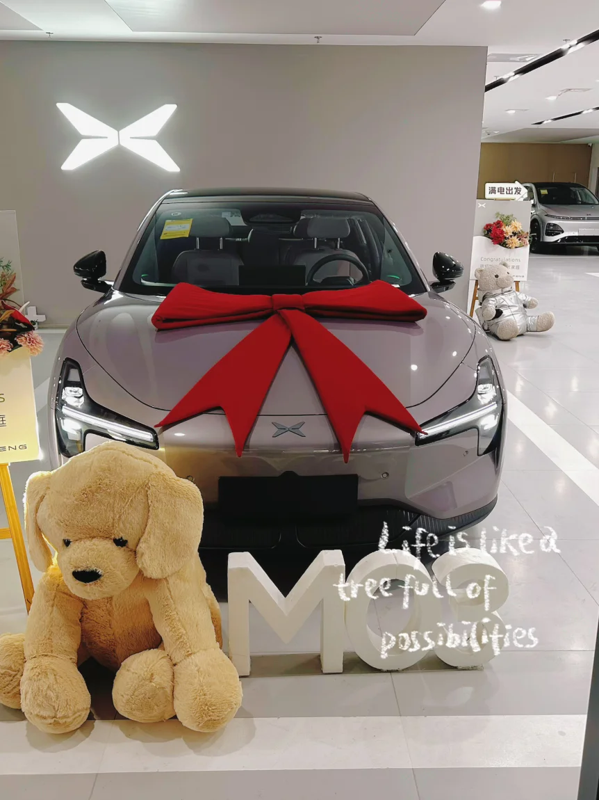 3. 仪式感拉满:最开心的就是拍照环节!交付中心准备了鲜花和提车牌,工作人员拍照技术也很赞,这大概就是加入“鹏友圈”的第一份温暖吧 。