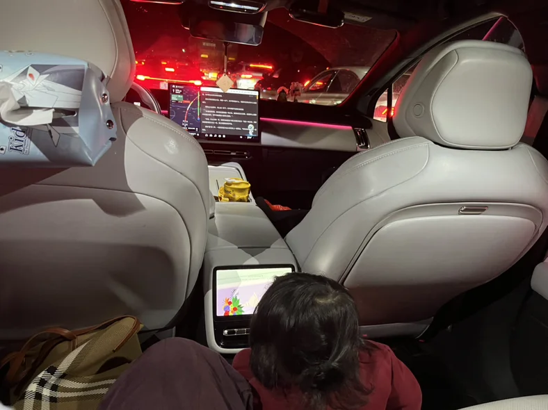 车内空间宽敞舒适,孩子在后座看视频,大大的减轻了老婆带孩子的疲乏,妻子悠闲刷着手机,静谧的座舱隔绝了外界的喧嚣。