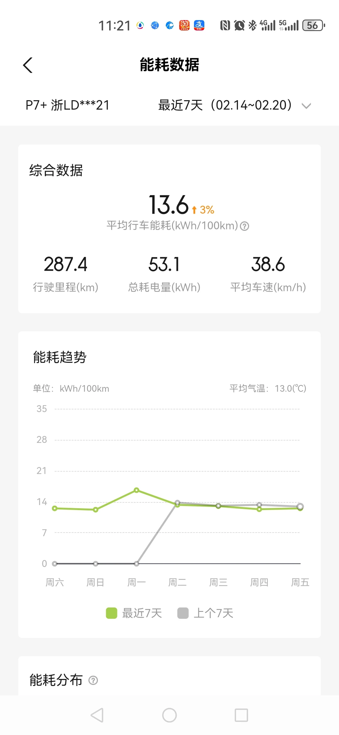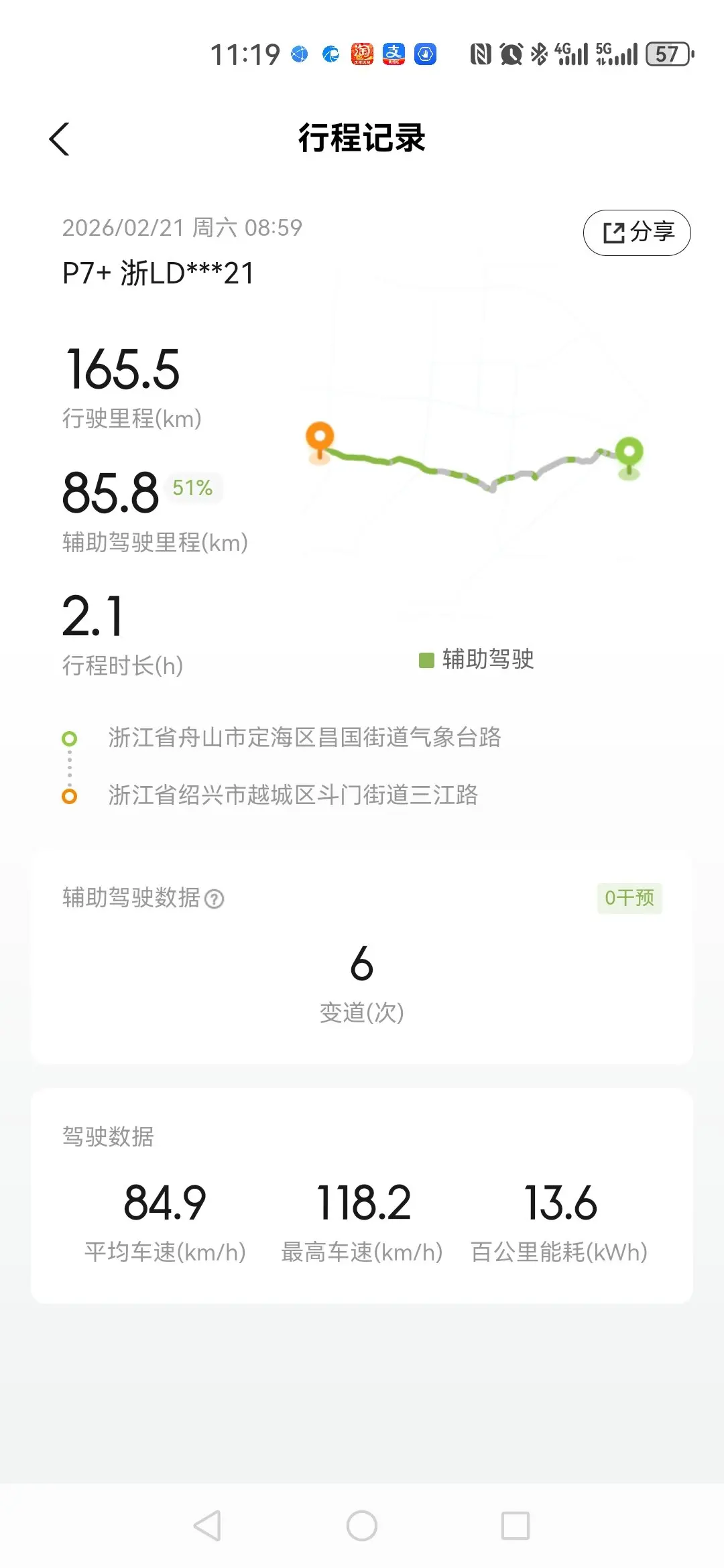 提车后的第一趟长途,从舟山到绍兴,165.5公里的路程,全程辅助驾驶,百公里能耗13.6kWh,平均车速84.9km/h,最高车速118.2km/h,0干预,6次变道,稳稳拿捏。 最近7天综合能耗13.6kWh/100km,总耗电53.1kWh,行驶287.4km,平均车速38.6km/h,在13℃的气温下,这个表现很满意。 满电WLTP 485km,97%电量,续航扎实,出行更安心。 紫色的小鹏P7+,在充电站里格外亮眼,科技与颜值并存,每一次出发都充满期待。