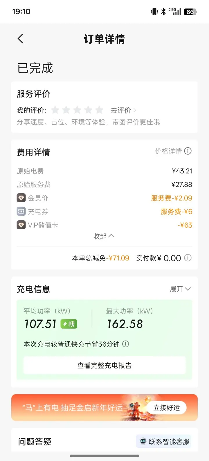更惊喜的是充电成本。通过会员价、充电券和VIP储值卡的叠加优惠,这单总减免了71.09元,最终实付0元!相当于用积分和电卡就把电充满了,这性价比直接拉满。