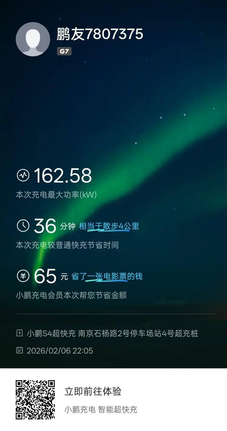 在南京石杨路的小鹏S4超充站,我体验到了什么叫“快、稳、省”。插上枪,最大功率直接飙到162.58kW,平均功率也有107.51kW,比普通快充足足节省了36分钟,喝杯咖啡、陪孩子玩会儿的功夫,电就充满了,完全不耽误行程。