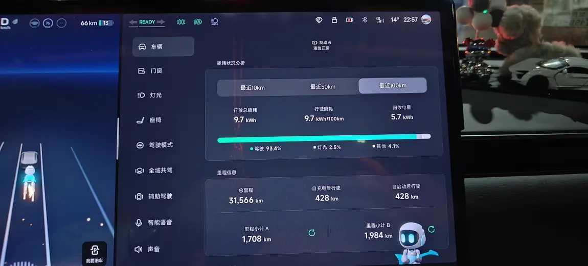 - 能耗数据:从车机截图看,最近100km行驶能耗为 9.7 kWh/100km,在14℃的气温下,这个表现非常优秀,说明车辆在冬季高速工况下的效率很高。