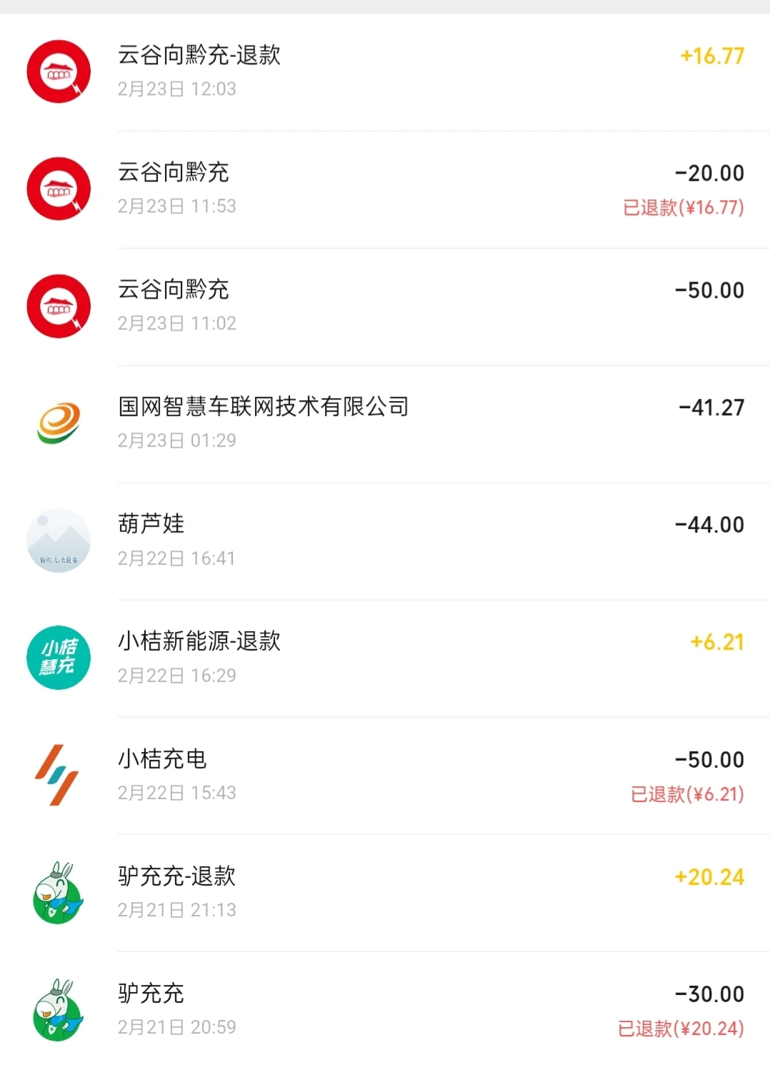 - 2月23日:国网智慧车联网,41.27元;云谷向黔充,实付3.23元(20-16.77)+50元