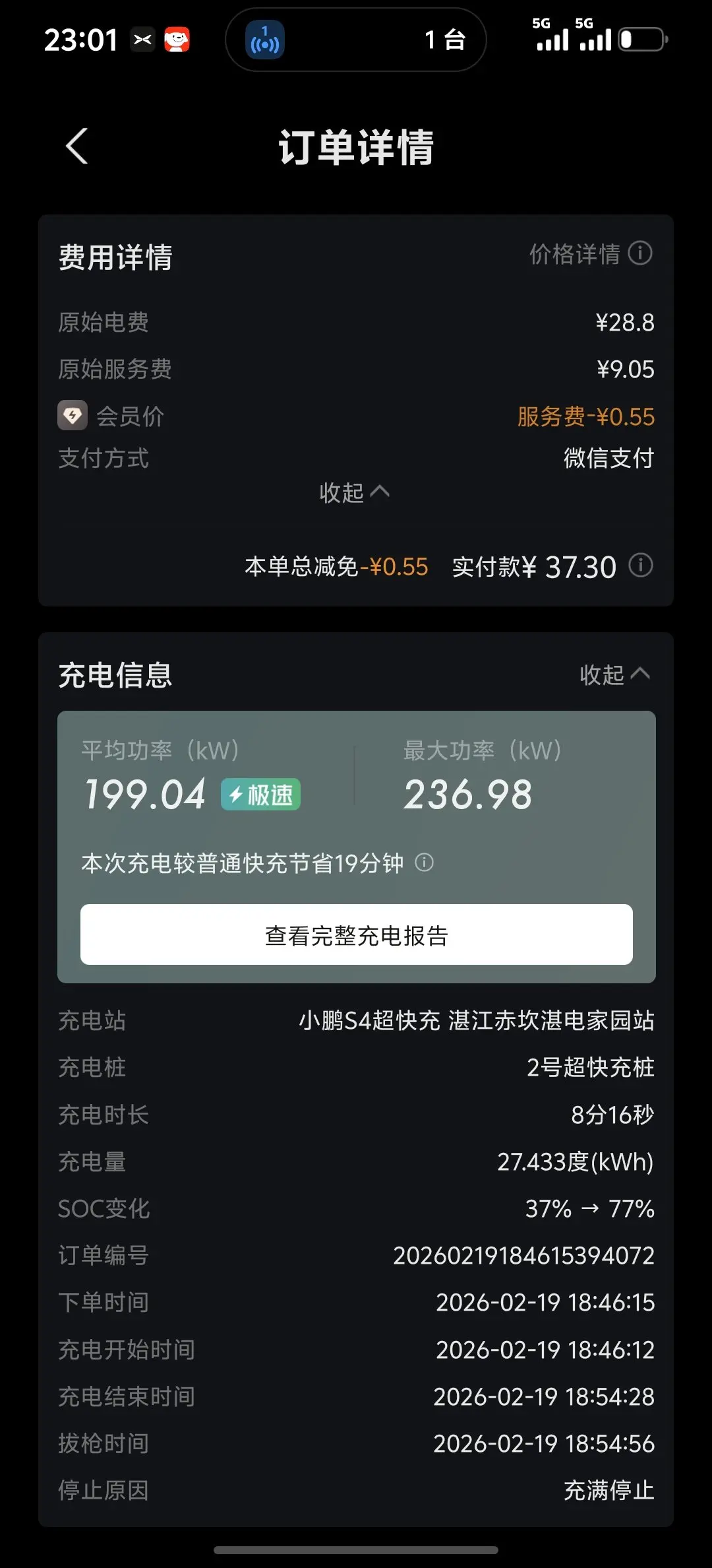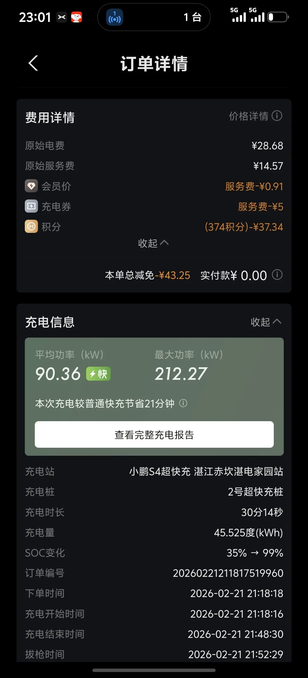 #鹏友充电攻略# 开着小鹏回家过年# app上面的充电指引很是方便,无论是停车场还是充电桩都有明确的标记。不过第一次充电,发现时间来早了,19点前要一块多一度电,第二回学聪明了,19点后才来,0.92元一度电。其实最划算的是0-8点,才0.56元一度电。第一次开电车,令我诧异的是充电居然这么快,由35%到100%只有30来分钟,真的是一杯奶茶的时间。