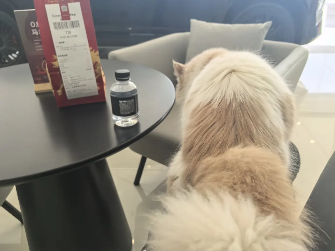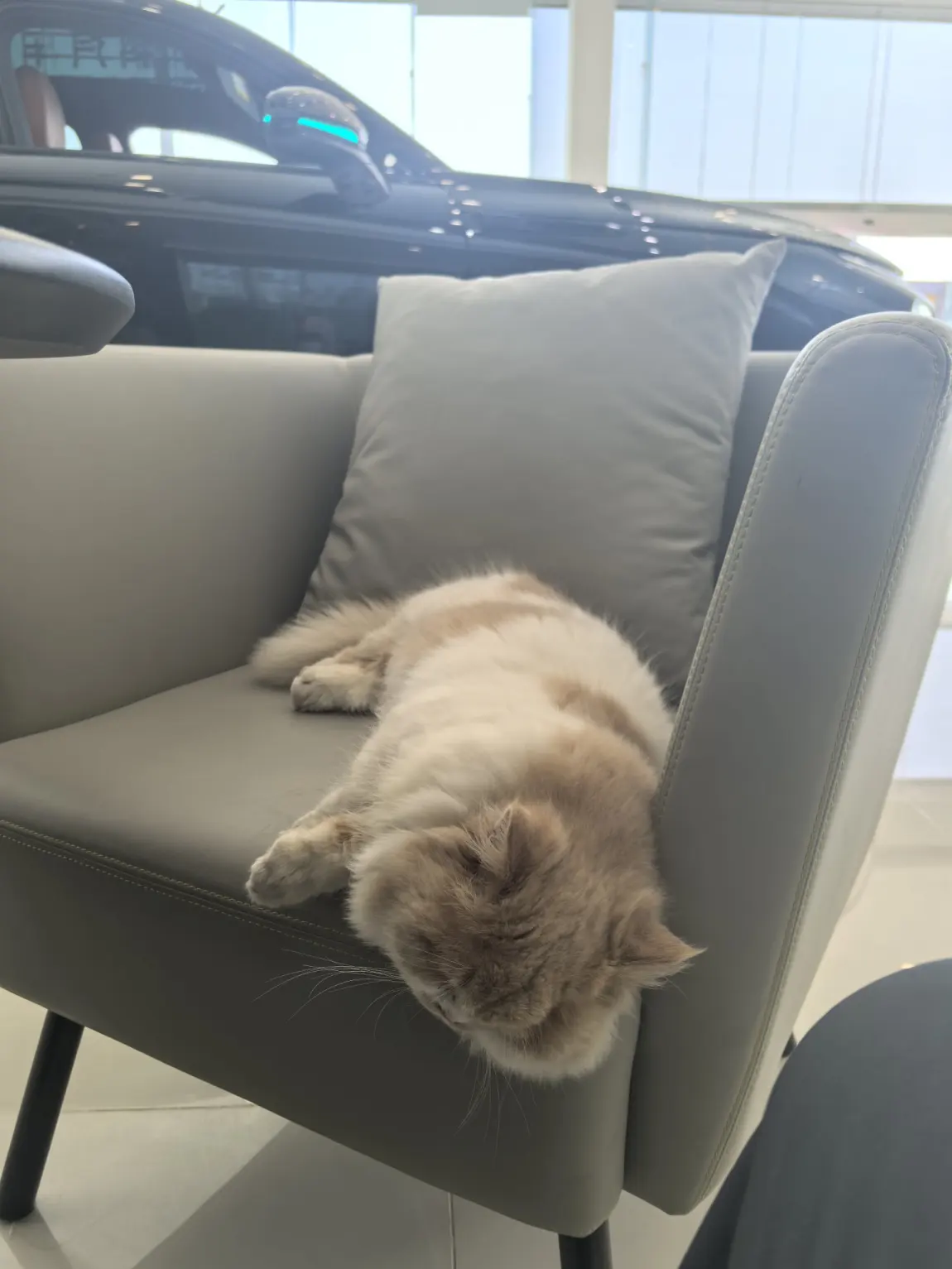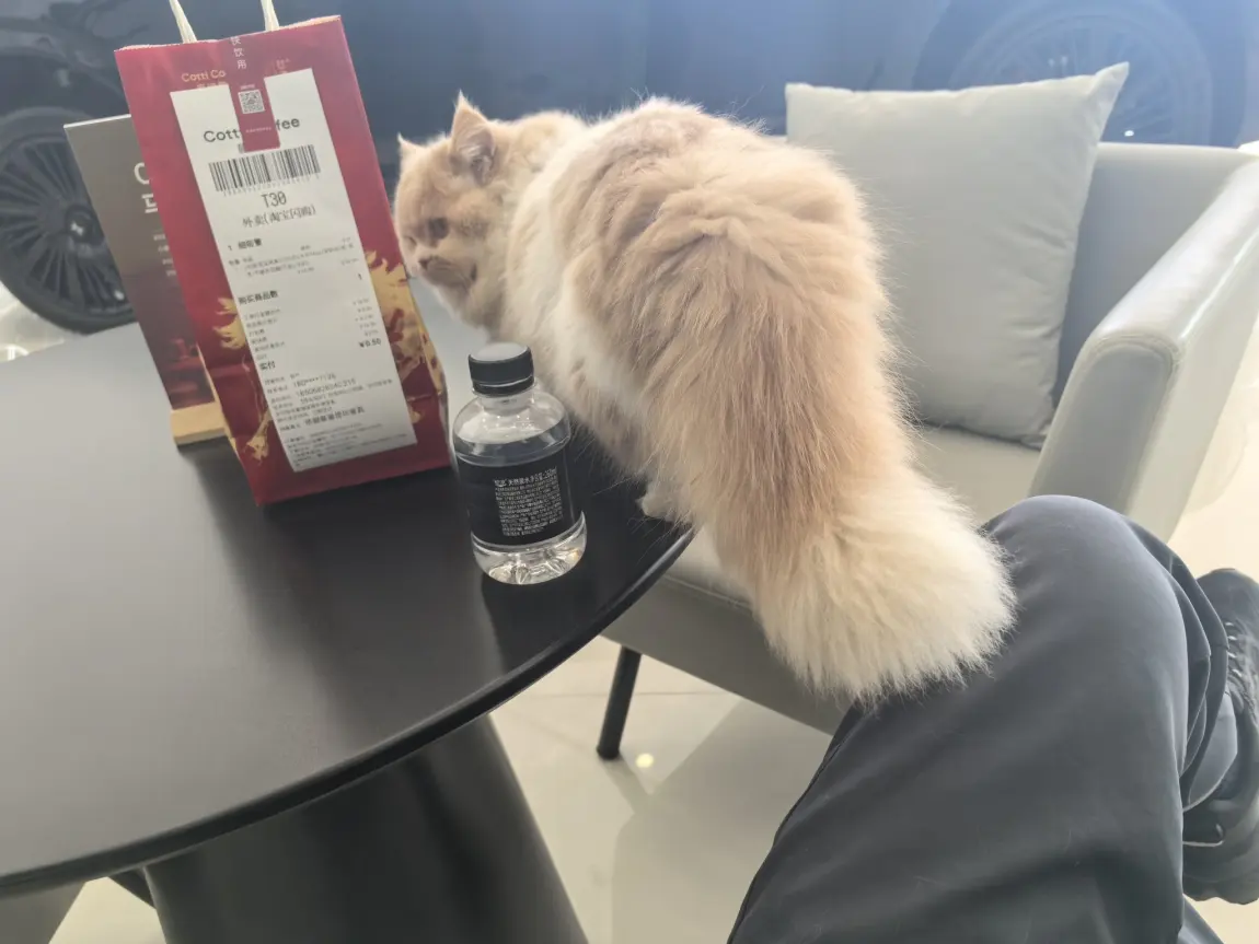 正在等待车子保养玩手机,突然一个东西跳我腿上,哈哈,吓我一跳,不过这只猫还挺乖,也很干净,不知道主人家是不是在找它。