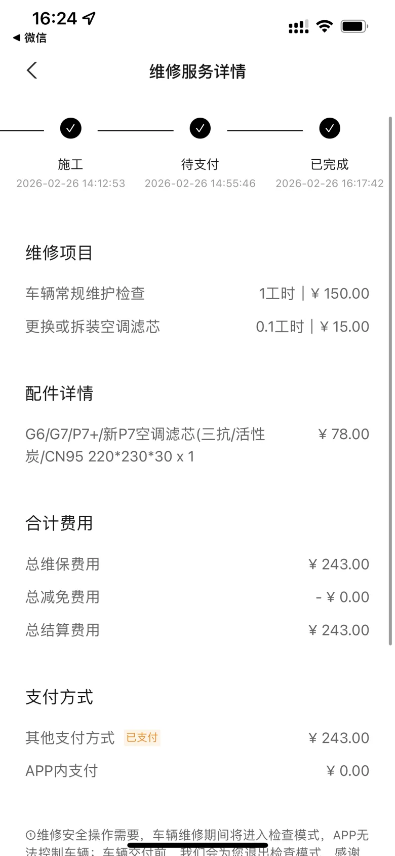 休息区环境舒适,服务贴心,等待过程轻松不枯燥。从接车到完工,整体节奏紧凑,不耽误过多时间,真正做到高效省心。完工后车辆洁净,细节处理到位,还贴心告知用车注意事项。