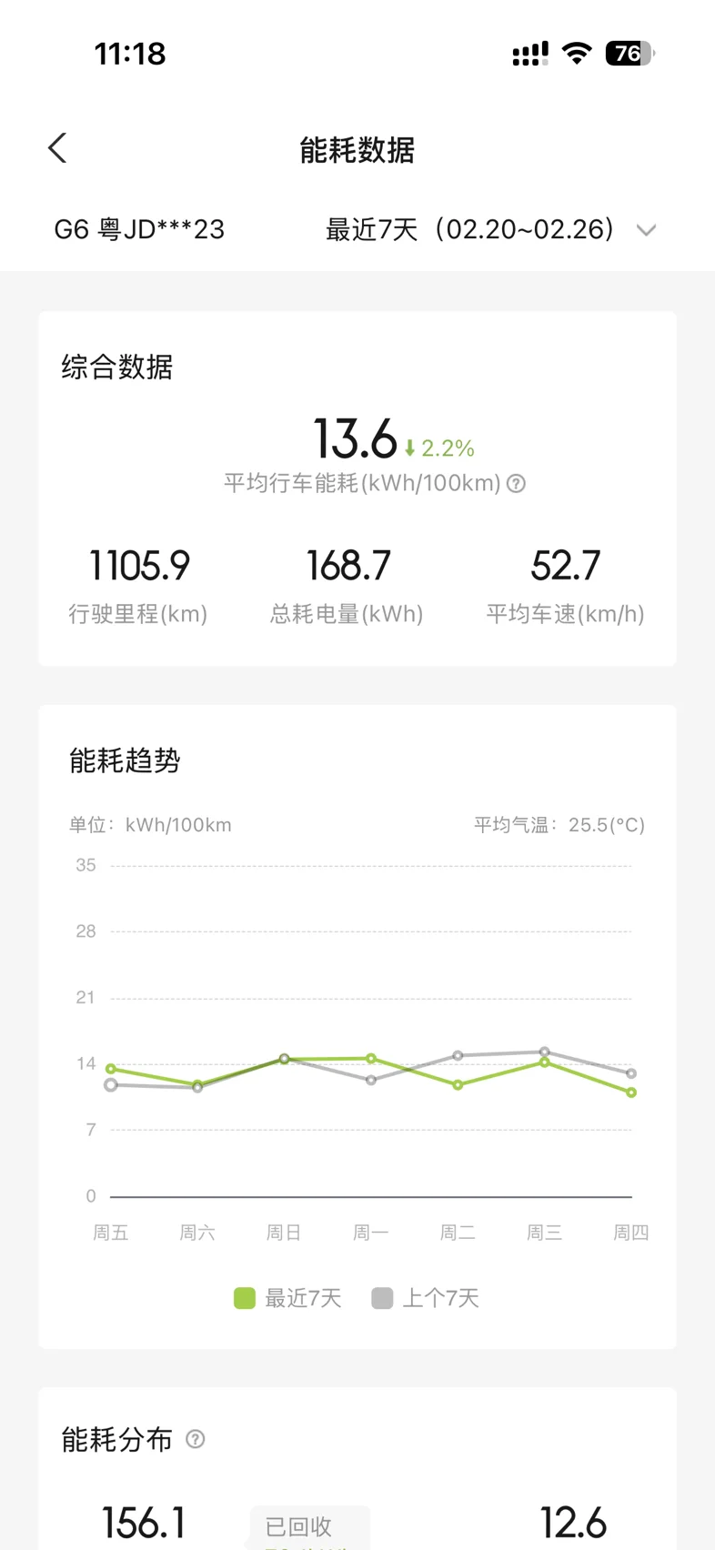 这7天我总共跑了1105.9km,平均行车能耗只有13.6kWh/100km,比上一个7天还低了2.2%!在平均气温25.5℃的情况下,这个能耗表现真的很能打,完全不用担心续航缩水。