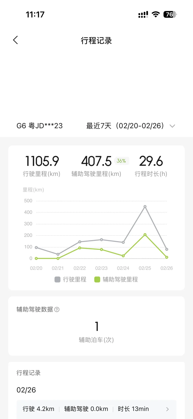 这趟长途最让我惊喜的,就是小鹏的辅助驾驶。7天里我用了407.5km的辅助驾驶里程,占总里程的36%!尤其是在高速上,NGP自动导航辅助驾驶真的太香了,自动跟车、变道、超车都很丝滑,我只需要把手放在方向盘上,大大缓解了长途驾驶的疲劳。