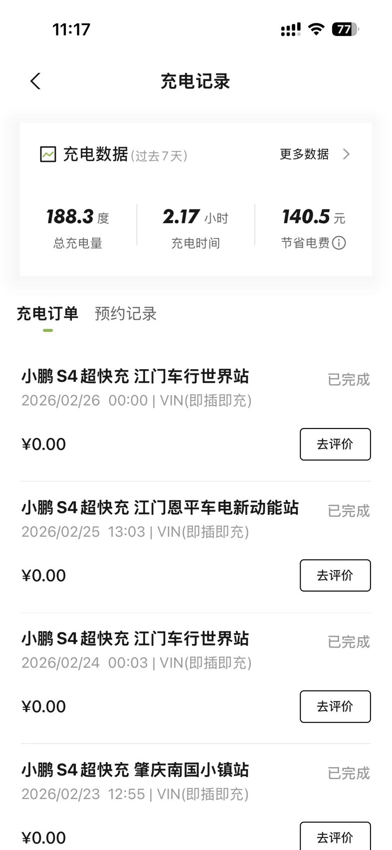充电方面,我用的都是小鹏S4超快充桩,7天总充电量188.3度,总时长才2.17小时,平均下来每次充电也就半小时左右。有一次充电,平均功率达到了79.48kW,最大功率更是冲到了180.55kW,比普通快充足足节省了23分钟!而且因为有会员价、充电券和VIP储值卡,这几单充电居然都是0元,四舍五入等于白嫖,太香了!