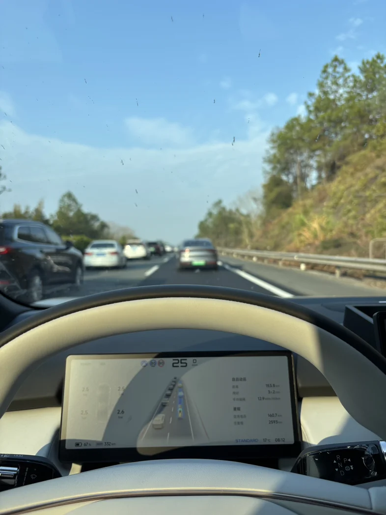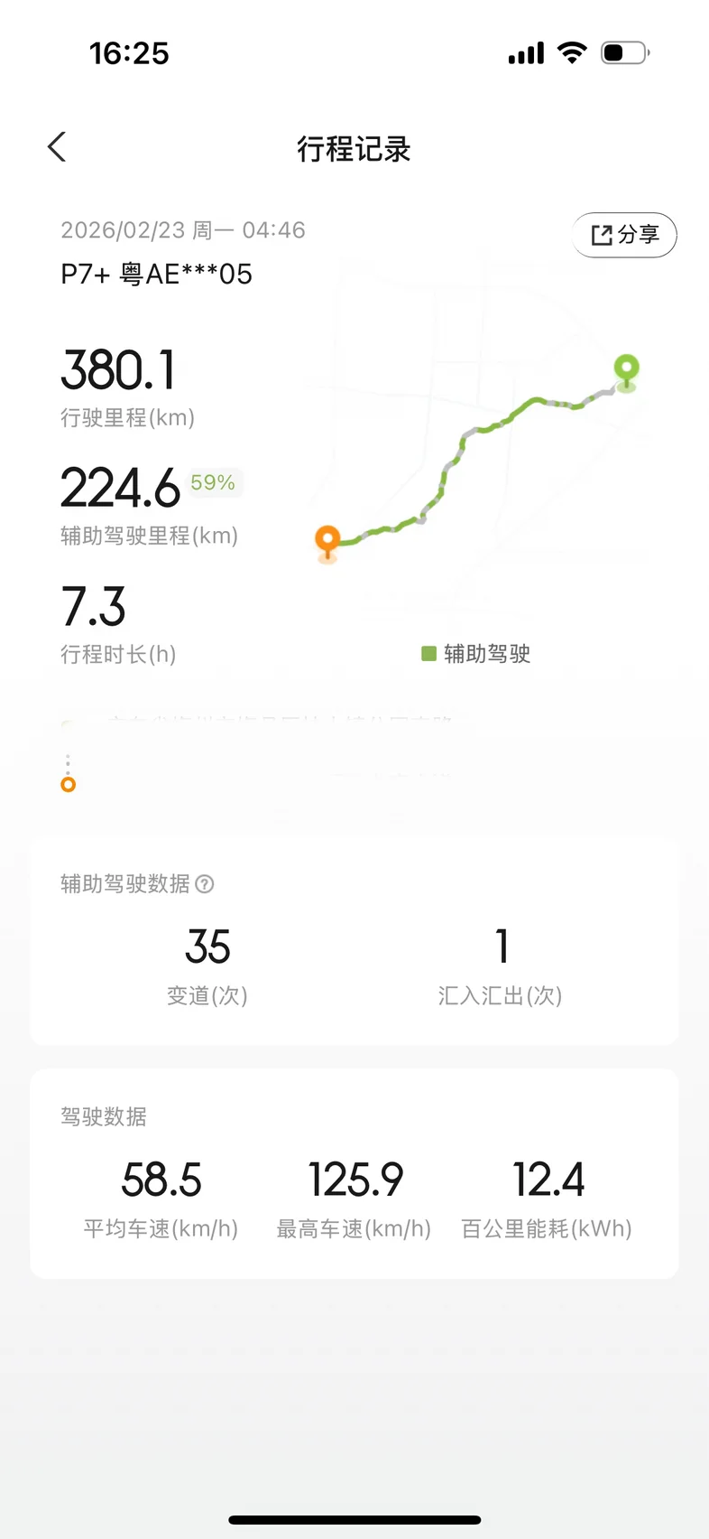 刚翻看到返程的行程记录,2月23号凌晨4点多出发回广州,380公里,开了7个多小时(懂的都懂,堵车堵到怀疑人生)。但这次真的被小鹏P7+的智驾狠狠治愈了!辅助驾驶跑了224公里,占比近60%!高速上基本全靠它,变道35次,自动汇入汇出,全程稳如老狗。堵车时更绝,直接开启跟车模式,双脚彻底解放,不用一脚油门一脚刹车踩到抽筋,我就负责吃零食听歌,看前车尾灯当烟花🎆,复杂路段偶尔接管下,不堵的时候自己开一段赶赶路。