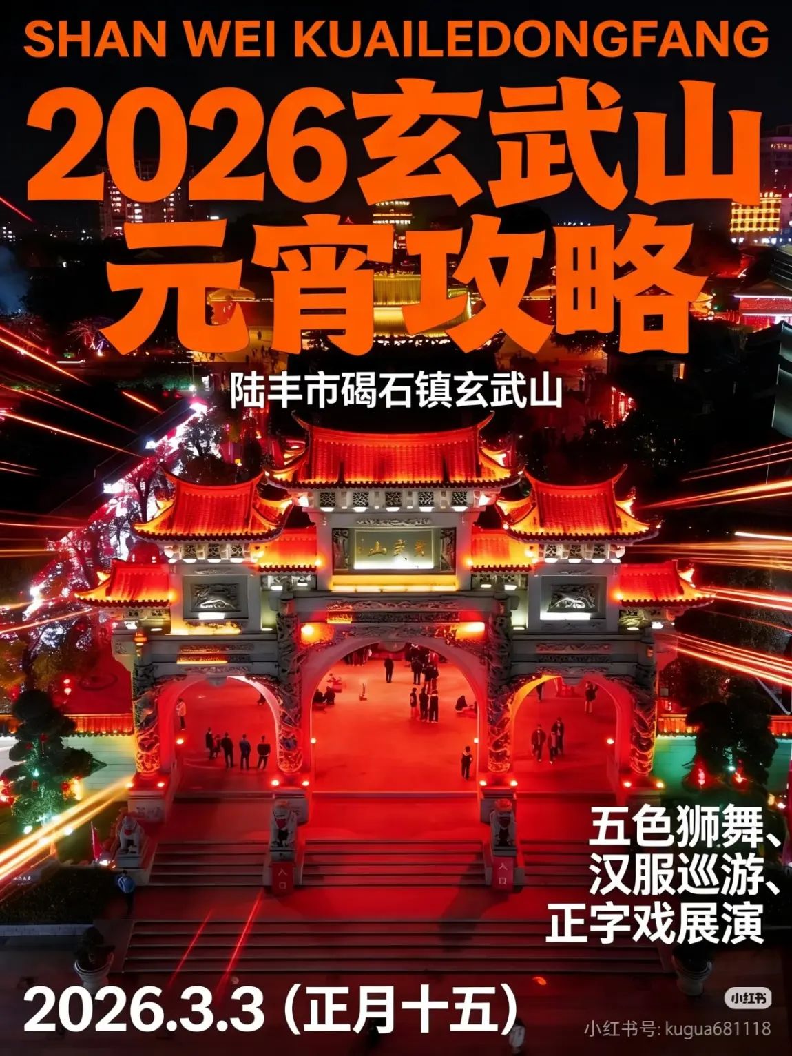 #万家灯火晒元宵# 元宵节当然是推荐我家乡碣石的必去景点玄武山啦,喜欢人山人海你就来。2026闹元宵,来陆丰碣石玄武山享受赴一场非遗盛宴。省级非遗五色狮舞秀、汉服巡游、正字戏展。📅元宵核心活动|2026.3.3(正月十五)📍地点:陆丰市碣石镇玄武山景区💥必看亮点▫️五色狮舞|省级非遗天花板🔥 青蓝红黄深蓝五色象征五行,狮身藏烛火,夜间表演流光溢彩▫️非遗展演|醒狮PK、正字戏唱腔韵味十足,还有汉服小姐姐沉浸式走秀+古筝演奏▫️民俗巡游|跟着非遗队伍逛景区,听锣鼓喧天,感受地道的海陆丰元宵烟火气。