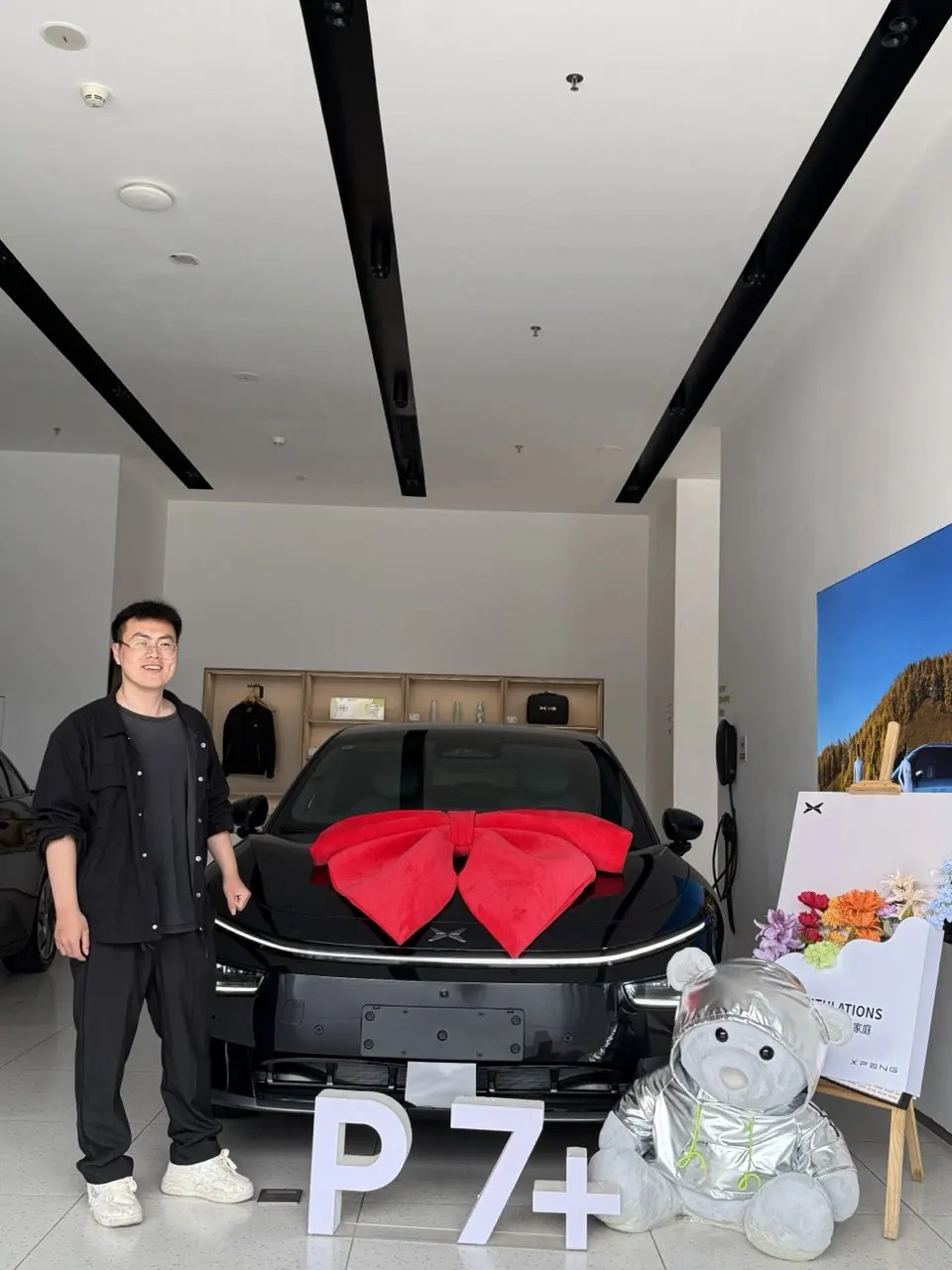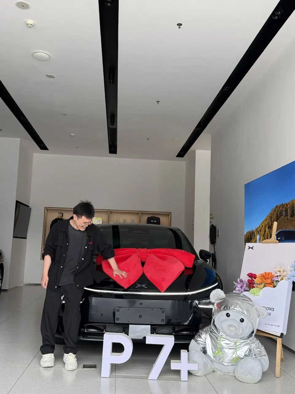 - 交付小姐姐特别热情,不仅早早在门口等我,还递上了定制的小鹏玩偶和鲜花。