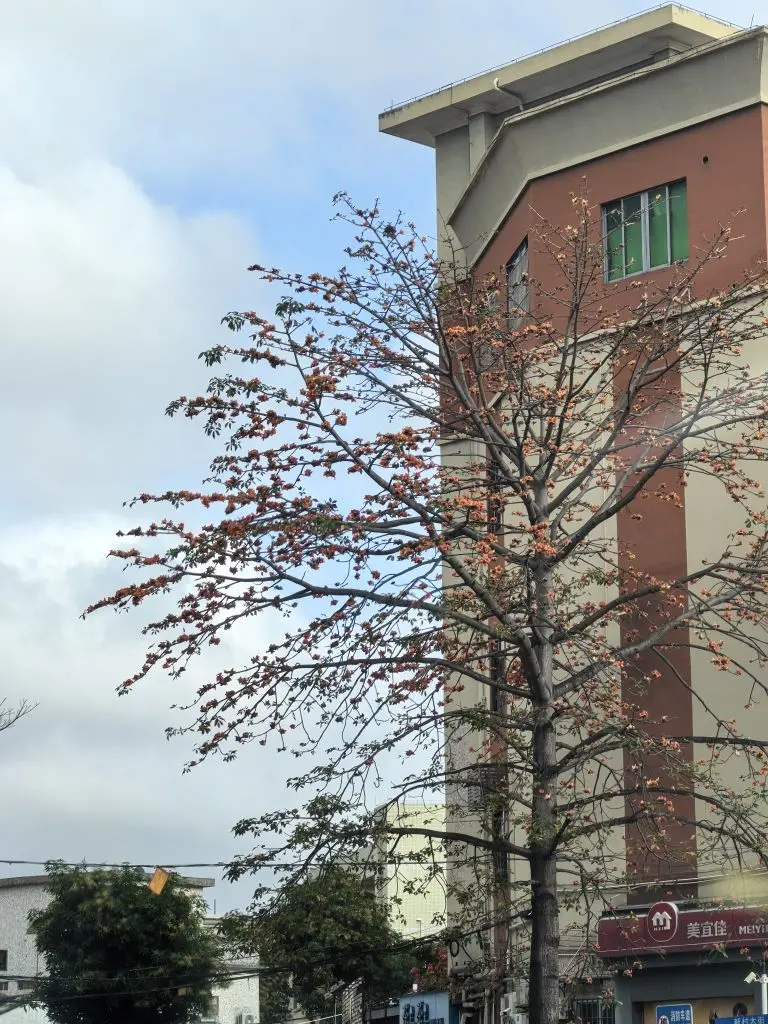 路上有棵橙色木棉花