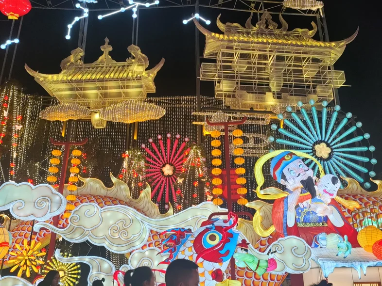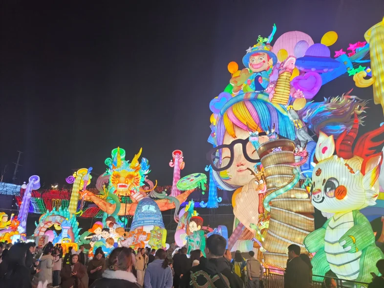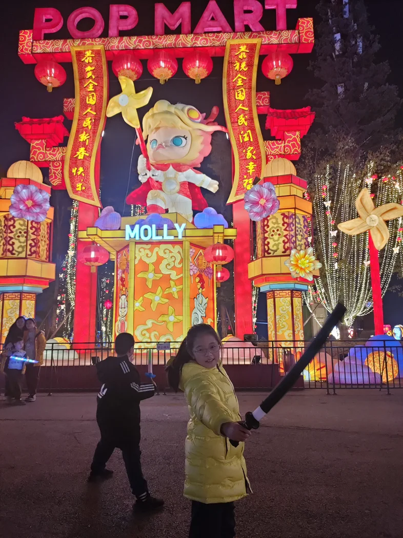 傍晚六点亮灯,灯海瞬间活了。“赛博敦煌飞天”的飘带随音乐摆动,像要从灯组里飞出来;“盐街灯市”复刻了古盐商的热闹,卖糖画的爷爷举着兔子灯,和我们车上的那只简直一模一样。娃跑累了,钻回P7+里啃面包,座椅加热烘着他冻红的手,妻子笑着说:“你看,咱家车比灯会还暖。”