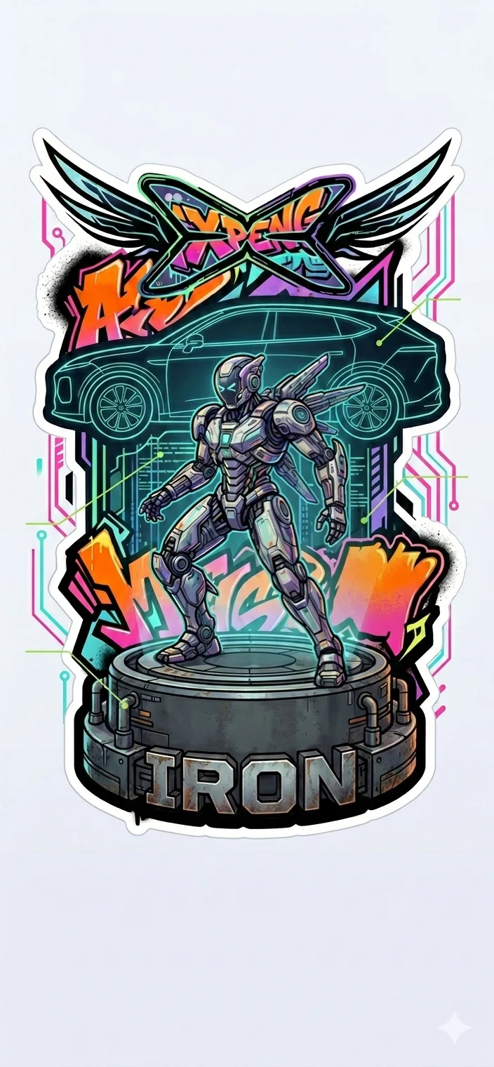 • IRON: 小P脚下踩着一个具有金属工业纹理的基座,上嵌有“IRON”和“小鹏汽车”文字(已标注)。